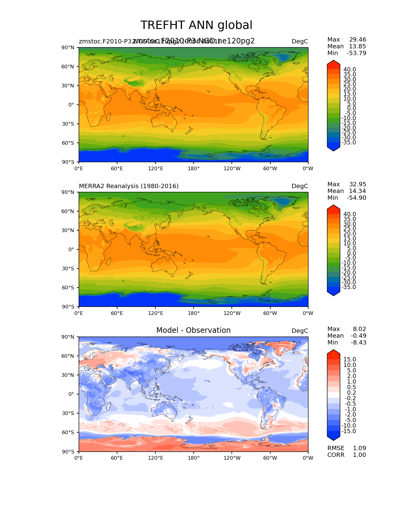 Use this command to recreate this image: | e3sm_diags lat_lon --no_viewer --case_id 'MERRA2' --sets 'lat_lon' --run_type 'model_vs_obs' --variables 'TREFHT' --seasons 'ANN' --regions 'global' --regrid_tool 'esmf' --regrid_method 'conservative' --main_title 'TREFHT ANN global' --backend 'mpl' --output_format 'png' --canvas_size_w '1212' --canvas_size_h '1628' --figsize '8.5' '11.0' --dpi '150' --arrows --contour_levels '-35' '-30' '-25' '-20' '-15' '-10' '-5' '0' '5' '10' '15' '20' '25' '30' '35' '40' --test_name 'zmstoc.F2010-P3.NGD.ne120pg2' --test_title 'zmstoc.F2010-P3.NGD.ne120pg2' --test_colormap 'cet_rainbow.rgb' --ref_name 'MERRA2' --reference_name 'MERRA2 Reanalysis' --reference_colormap 'cet_rainbow.rgb' --diff_title 'Model - Observation' --diff_colormap 'diverging_bwr.rgb' --diff_levels '-15' '-10' '-5' '-2' '-1' '-0.5' '-0.2' '0.2' '0.5' '1' '2' '5' '10' '15' --num_workers '4' --granulate 'variables' 'seasons' 'plevs' 'regions' --selectors 'sets' 'seasons' --reference_data_path '/global/cfs/cdirs/e3sm/acme_diags/obs_for_e3sm_diags/climatology/' --test_data_path '/global/cscratch1/sd/xsongsio/E3SM_simulations/zmstoc.F2010-P3.NGD.ne120pg2/diag/clim_rgr/6yr/' --results_dir '/global/cfs/cdirs/e3sm/www/xsongsio/zmstoc.F2010-P3.NGD.ne120pg2/6yr' |