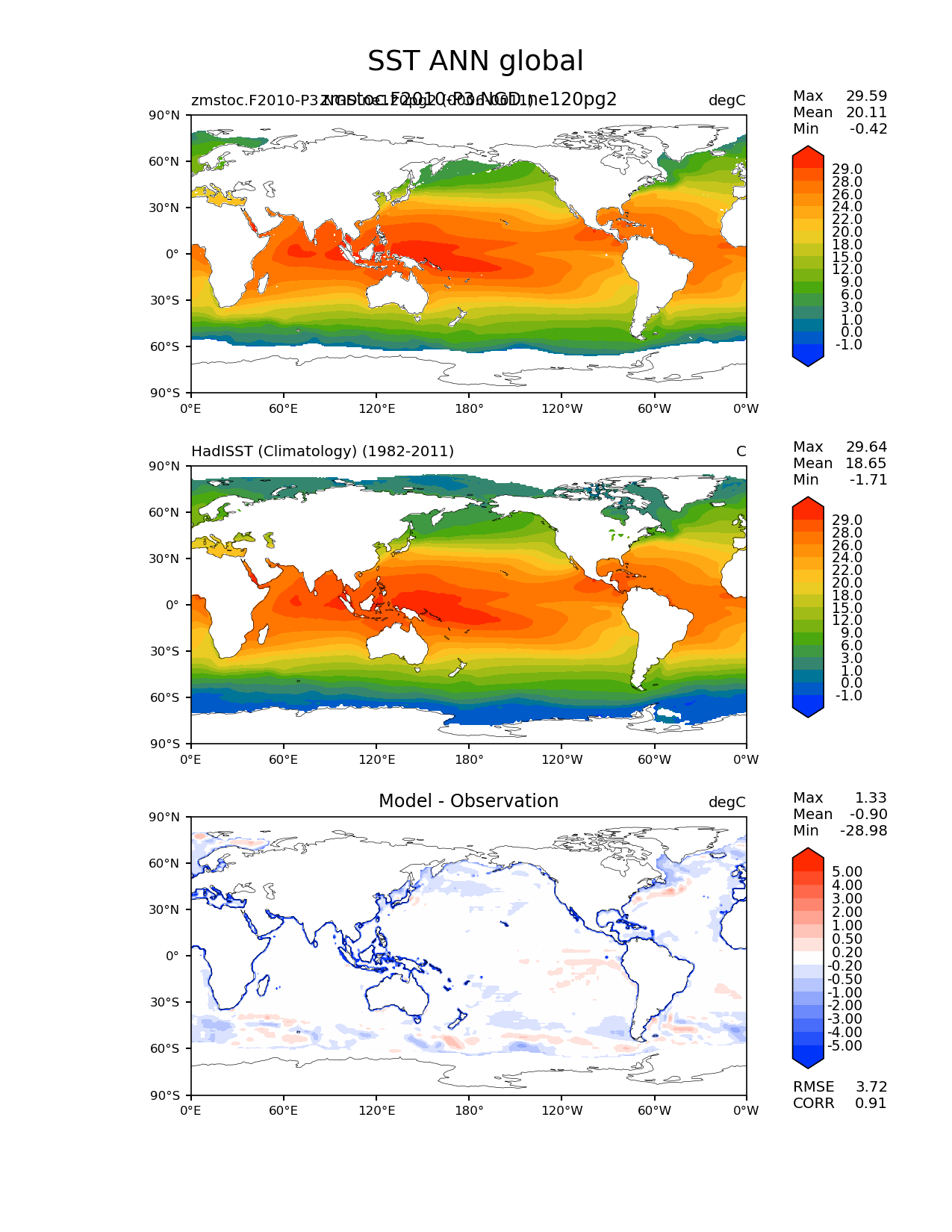 Use this command to recreate this image: | e3sm_diags lat_lon --no_viewer --case_id 'SST_CL_HadISST' --sets 'lat_lon' --run_type 'model_vs_obs' --variables 'SST' --seasons 'ANN' --regions 'global' --regrid_tool 'esmf' --regrid_method 'conservative' --main_title 'SST ANN global' --backend 'mpl' --output_format 'png' --canvas_size_w '1212' --canvas_size_h '1628' --figsize '8.5' '11.0' --dpi '150' --arrows --contour_levels '-1' '0' '1' '3' '6' '9' '12' '15' '18' '20' '22' '24' '26' '28' '29' --test_name 'zmstoc.F2010-P3.NGD.ne120pg2' --test_title 'zmstoc.F2010-P3.NGD.ne120pg2' --test_colormap 'cet_rainbow.rgb' --ref_name 'HadISST_CL' --reference_name 'HadISST (Climatology)' --reference_colormap 'cet_rainbow.rgb' --diff_title 'Model - Observation' --diff_colormap 'diverging_bwr.rgb' --diff_levels '-5' '-4' '-3' '-2' '-1' '-0.5' '-0.2' '0.2' '0.5' '1' '2' '3' '4' '5' --num_workers '4' --granulate 'variables' 'seasons' 'plevs' 'regions' --selectors 'sets' 'seasons' --reference_data_path '/global/cfs/cdirs/e3sm/acme_diags/obs_for_e3sm_diags/climatology/' --test_data_path '/global/cscratch1/sd/xsongsio/E3SM_simulations/zmstoc.F2010-P3.NGD.ne120pg2/diag/clim_rgr/6yr/' --results_dir '/global/cfs/cdirs/e3sm/www/xsongsio/zmstoc.F2010-P3.NGD.ne120pg2/6yr' |