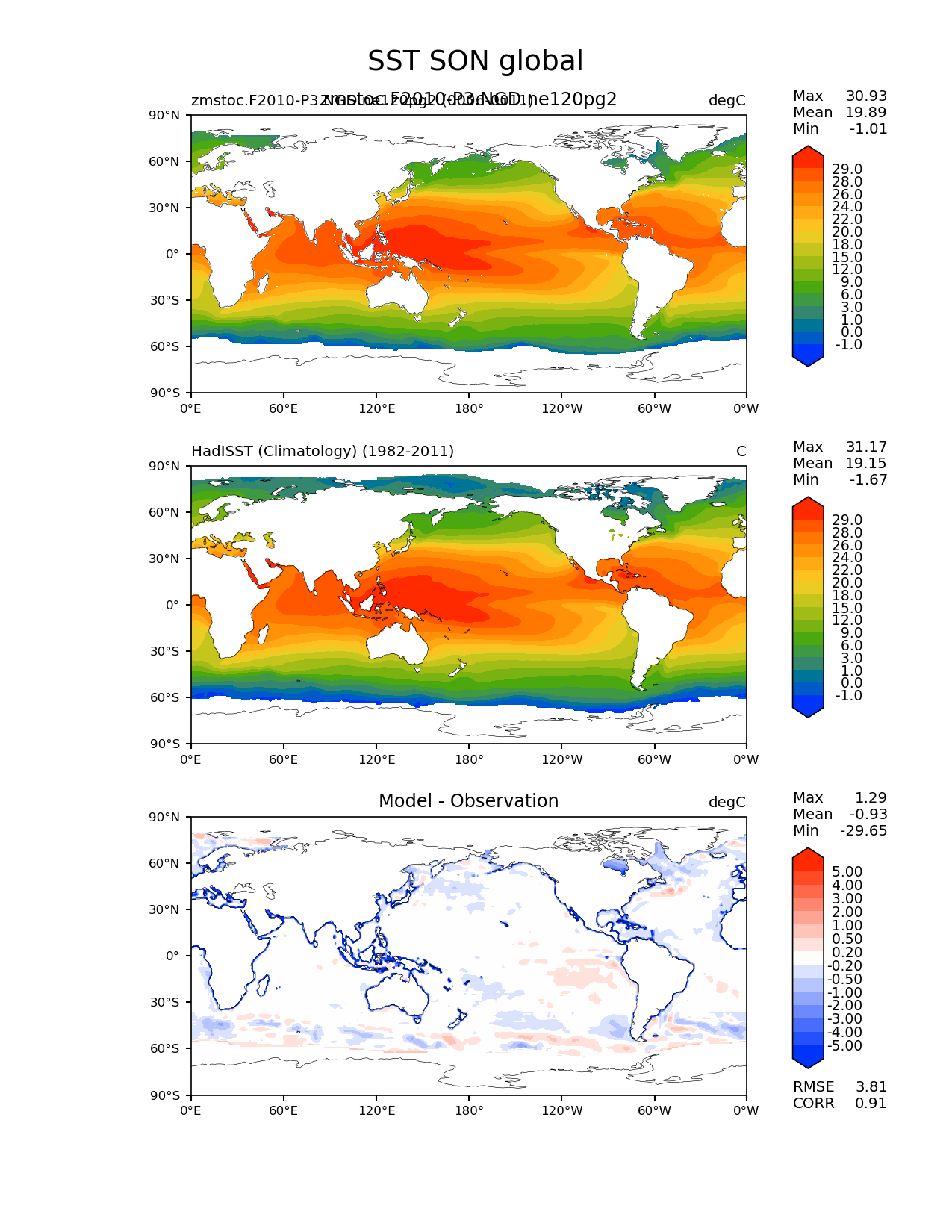 Use this command to recreate this image: | e3sm_diags lat_lon --no_viewer --case_id 'SST_CL_HadISST' --sets 'lat_lon' --run_type 'model_vs_obs' --variables 'SST' --seasons 'SON' --regions 'global' --regrid_tool 'esmf' --regrid_method 'conservative' --main_title 'SST SON global' --backend 'mpl' --output_format 'png' --canvas_size_w '1212' --canvas_size_h '1628' --figsize '8.5' '11.0' --dpi '150' --arrows --contour_levels '-1' '0' '1' '3' '6' '9' '12' '15' '18' '20' '22' '24' '26' '28' '29' --test_name 'zmstoc.F2010-P3.NGD.ne120pg2' --test_title 'zmstoc.F2010-P3.NGD.ne120pg2' --test_colormap 'cet_rainbow.rgb' --ref_name 'HadISST_CL' --reference_name 'HadISST (Climatology)' --reference_colormap 'cet_rainbow.rgb' --diff_title 'Model - Observation' --diff_colormap 'diverging_bwr.rgb' --diff_levels '-5' '-4' '-3' '-2' '-1' '-0.5' '-0.2' '0.2' '0.5' '1' '2' '3' '4' '5' --num_workers '4' --granulate 'variables' 'seasons' 'plevs' 'regions' --selectors 'sets' 'seasons' --reference_data_path '/global/cfs/cdirs/e3sm/acme_diags/obs_for_e3sm_diags/climatology/' --test_data_path '/global/cscratch1/sd/xsongsio/E3SM_simulations/zmstoc.F2010-P3.NGD.ne120pg2/diag/clim_rgr/6yr/' --results_dir '/global/cfs/cdirs/e3sm/www/xsongsio/zmstoc.F2010-P3.NGD.ne120pg2/6yr' |