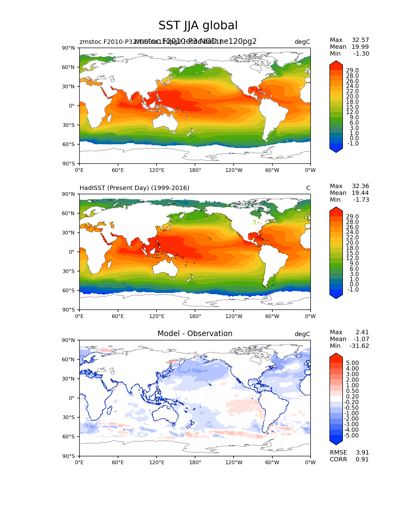 Use this command to recreate this image: | e3sm_diags lat_lon --no_viewer --case_id 'SST_PD_HadISST' --sets 'lat_lon' --run_type 'model_vs_obs' --variables 'SST' --seasons 'JJA' --regions 'global' --regrid_tool 'esmf' --regrid_method 'conservative' --main_title 'SST JJA global' --backend 'mpl' --output_format 'png' --canvas_size_w '1212' --canvas_size_h '1628' --figsize '8.5' '11.0' --dpi '150' --arrows --contour_levels '-1' '0' '1' '3' '6' '9' '12' '15' '18' '20' '22' '24' '26' '28' '29' --test_name 'zmstoc.F2010-P3.NGD.ne120pg2' --test_title 'zmstoc.F2010-P3.NGD.ne120pg2' --test_colormap 'cet_rainbow.rgb' --ref_name 'HadISST_PD' --reference_name 'HadISST (Present Day)' --reference_colormap 'cet_rainbow.rgb' --diff_title 'Model - Observation' --diff_colormap 'diverging_bwr.rgb' --diff_levels '-5' '-4' '-3' '-2' '-1' '-0.5' '-0.2' '0.2' '0.5' '1' '2' '3' '4' '5' --num_workers '4' --granulate 'variables' 'seasons' 'plevs' 'regions' --selectors 'sets' 'seasons' --reference_data_path '/global/cfs/cdirs/e3sm/acme_diags/obs_for_e3sm_diags/climatology/' --test_data_path '/global/cscratch1/sd/xsongsio/E3SM_simulations/zmstoc.F2010-P3.NGD.ne120pg2/diag/clim_rgr/6yr/' --results_dir '/global/cfs/cdirs/e3sm/www/xsongsio/zmstoc.F2010-P3.NGD.ne120pg2/6yr' |