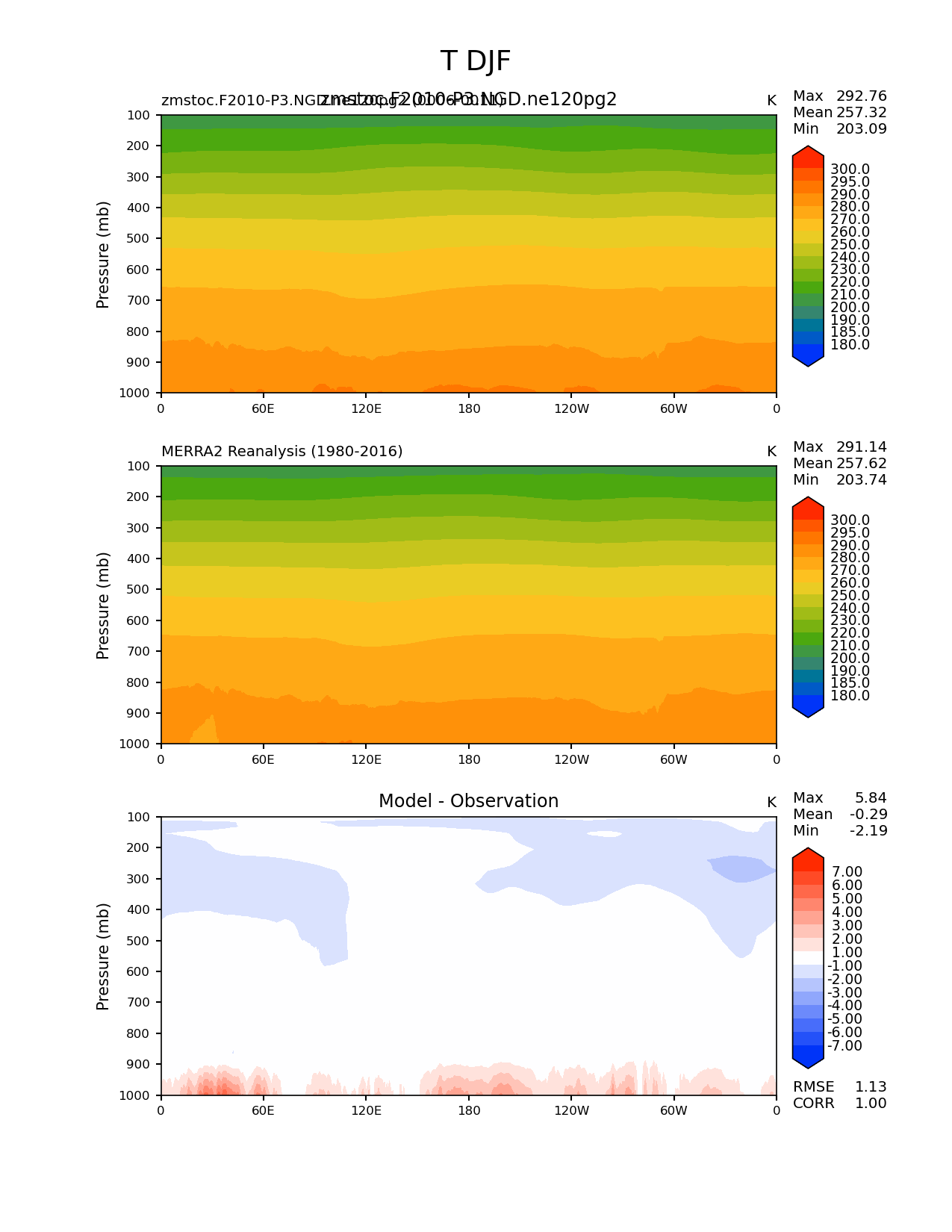 Use this command to recreate this image: | e3sm_diags meridional_mean_2d --no_viewer --case_id 'MERRA2' --sets 'meridional_mean_2d' --run_type 'model_vs_obs' --variables 'T' --seasons 'DJF' --regions 'global' --regrid_tool 'esmf' --regrid_method 'conservative' --plevs '100.0' '115.47819846894582' '133.3521432163324' '153.9926526059492' '177.82794100389228' '205.3525026457146' '237.13737056616552' '273.8419634264361' '316.22776601683796' '365.1741272548377' '421.6965034285823' '486.9675251658631' '562.341325190349' '649.3816315762114' '749.8942093324558' '865.9643233600654' '1000.0' --main_title 'T DJF' --backend 'mpl' --output_format 'png' --canvas_size_w '1212' --canvas_size_h '1628' --figsize '8.5' '11.0' --dpi '150' --arrows --contour_levels '180' '185' '190' '200' '210' '220' '230' '240' '250' '260' '270' '280' '290' '295' '300' --test_name 'zmstoc.F2010-P3.NGD.ne120pg2' --test_title 'zmstoc.F2010-P3.NGD.ne120pg2' --test_colormap 'cet_rainbow.rgb' --ref_name 'MERRA2' --reference_name 'MERRA2 Reanalysis' --reference_colormap 'cet_rainbow.rgb' --diff_title 'Model - Observation' --diff_colormap 'diverging_bwr.rgb' --diff_levels '-7' '-6' '-5' '-4' '-3' '-2' '-1' '1' '2' '3' '4' '5' '6' '7' --num_workers '4' --granulate 'variables' 'seasons' 'regions' --selectors 'sets' 'seasons' --reference_data_path '/global/cfs/cdirs/e3sm/acme_diags/obs_for_e3sm_diags/climatology/' --test_data_path '/global/cscratch1/sd/xsongsio/E3SM_simulations/zmstoc.F2010-P3.NGD.ne120pg2/diag/clim_rgr/6yr/' --results_dir '/global/cfs/cdirs/e3sm/www/xsongsio/zmstoc.F2010-P3.NGD.ne120pg2/6yr' |