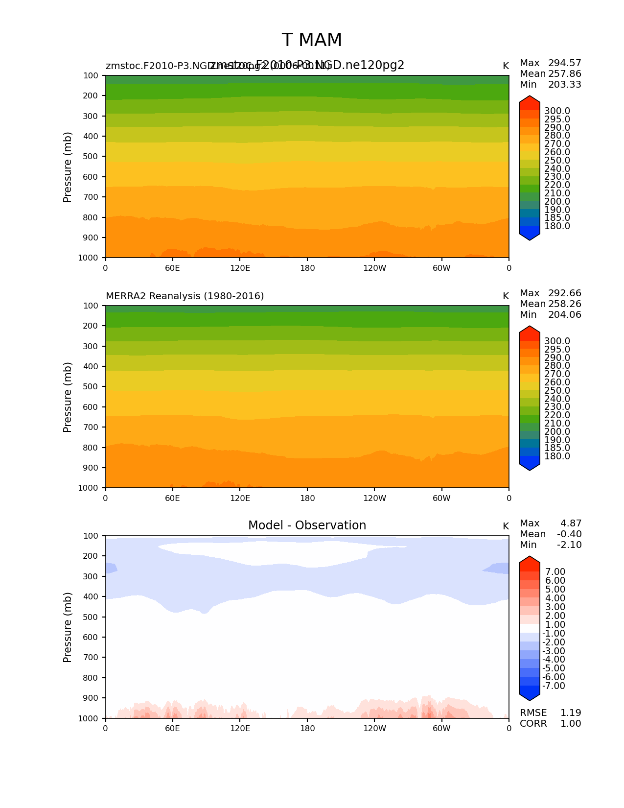 Use this command to recreate this image: | e3sm_diags meridional_mean_2d --no_viewer --case_id 'MERRA2' --sets 'meridional_mean_2d' --run_type 'model_vs_obs' --variables 'T' --seasons 'MAM' --regions 'global' --regrid_tool 'esmf' --regrid_method 'conservative' --plevs '100.0' '115.47819846894582' '133.3521432163324' '153.9926526059492' '177.82794100389228' '205.3525026457146' '237.13737056616552' '273.8419634264361' '316.22776601683796' '365.1741272548377' '421.6965034285823' '486.9675251658631' '562.341325190349' '649.3816315762114' '749.8942093324558' '865.9643233600654' '1000.0' --main_title 'T MAM' --backend 'mpl' --output_format 'png' --canvas_size_w '1212' --canvas_size_h '1628' --figsize '8.5' '11.0' --dpi '150' --arrows --contour_levels '180' '185' '190' '200' '210' '220' '230' '240' '250' '260' '270' '280' '290' '295' '300' --test_name 'zmstoc.F2010-P3.NGD.ne120pg2' --test_title 'zmstoc.F2010-P3.NGD.ne120pg2' --test_colormap 'cet_rainbow.rgb' --ref_name 'MERRA2' --reference_name 'MERRA2 Reanalysis' --reference_colormap 'cet_rainbow.rgb' --diff_title 'Model - Observation' --diff_colormap 'diverging_bwr.rgb' --diff_levels '-7' '-6' '-5' '-4' '-3' '-2' '-1' '1' '2' '3' '4' '5' '6' '7' --num_workers '4' --granulate 'variables' 'seasons' 'regions' --selectors 'sets' 'seasons' --reference_data_path '/global/cfs/cdirs/e3sm/acme_diags/obs_for_e3sm_diags/climatology/' --test_data_path '/global/cscratch1/sd/xsongsio/E3SM_simulations/zmstoc.F2010-P3.NGD.ne120pg2/diag/clim_rgr/6yr/' --results_dir '/global/cfs/cdirs/e3sm/www/xsongsio/zmstoc.F2010-P3.NGD.ne120pg2/6yr' |