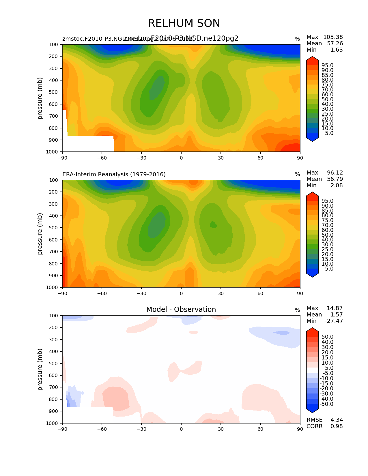 Use this command to recreate this image: | e3sm_diags zonal_mean_2d --no_viewer --case_id 'ERA-Interim' --sets 'zonal_mean_2d' --run_type 'model_vs_obs' --variables 'RELHUM' --seasons 'SON' --regions 'global' --regrid_tool 'esmf' --regrid_method 'conservative' --plevs '100.0' '115.47819846894582' '133.3521432163324' '153.9926526059492' '177.82794100389228' '205.3525026457146' '237.13737056616552' '273.8419634264361' '316.22776601683796' '365.1741272548377' '421.6965034285823' '486.9675251658631' '562.341325190349' '649.3816315762114' '749.8942093324558' '865.9643233600654' '1000.0' --main_title 'RELHUM SON' --backend 'mpl' --output_format 'png' --canvas_size_w '1212' --canvas_size_h '1628' --figsize '8.5' '11.0' --dpi '150' --arrows --contour_levels '5' '10' '15' '20' '25' '30' '40' '50' '60' '70' '75' '80' '85' '90' '95' --test_name 'zmstoc.F2010-P3.NGD.ne120pg2' --test_title 'zmstoc.F2010-P3.NGD.ne120pg2' --test_colormap 'cet_rainbow.rgb' --ref_name 'ERA-Interim' --reference_name 'ERA-Interim Reanalysis' --reference_colormap 'cet_rainbow.rgb' --diff_title 'Model - Observation' --diff_colormap 'diverging_bwr.rgb' --diff_levels '-50' '-40' '-30' '-20' '-15' '-10' '-5' '5' '10' '15' '20' '30' '40' '50' --num_workers '4' --granulate 'variables' 'seasons' 'regions' --selectors 'sets' 'seasons' --reference_data_path '/global/cfs/cdirs/e3sm/acme_diags/obs_for_e3sm_diags/climatology/' --test_data_path '/global/cscratch1/sd/xsongsio/E3SM_simulations/zmstoc.F2010-P3.NGD.ne120pg2/diag/clim_rgr/6yr/' --results_dir '/global/cfs/cdirs/e3sm/www/xsongsio/zmstoc.F2010-P3.NGD.ne120pg2/6yr' |
