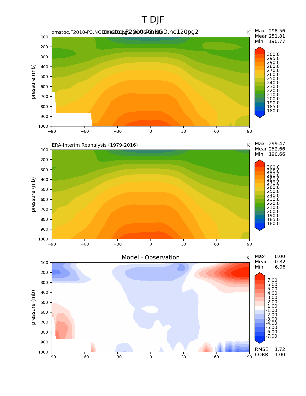 Use this command to recreate this image: | e3sm_diags zonal_mean_2d --no_viewer --case_id 'ERA-Interim' --sets 'zonal_mean_2d' --run_type 'model_vs_obs' --variables 'T' --seasons 'DJF' --regions 'global' --regrid_tool 'esmf' --regrid_method 'conservative' --plevs '100.0' '115.47819846894582' '133.3521432163324' '153.9926526059492' '177.82794100389228' '205.3525026457146' '237.13737056616552' '273.8419634264361' '316.22776601683796' '365.1741272548377' '421.6965034285823' '486.9675251658631' '562.341325190349' '649.3816315762114' '749.8942093324558' '865.9643233600654' '1000.0' --main_title 'T DJF' --backend 'mpl' --output_format 'png' --canvas_size_w '1212' --canvas_size_h '1628' --figsize '8.5' '11.0' --dpi '150' --arrows --contour_levels '180' '185' '190' '200' '210' '220' '230' '240' '250' '260' '270' '280' '290' '295' '300' --test_name 'zmstoc.F2010-P3.NGD.ne120pg2' --test_title 'zmstoc.F2010-P3.NGD.ne120pg2' --test_colormap 'cet_rainbow.rgb' --ref_name 'ERA-Interim' --reference_name 'ERA-Interim Reanalysis' --reference_colormap 'cet_rainbow.rgb' --diff_title 'Model - Observation' --diff_colormap 'diverging_bwr.rgb' --diff_levels '-7' '-6' '-5' '-4' '-3' '-2' '-1' '1' '2' '3' '4' '5' '6' '7' --num_workers '4' --granulate 'variables' 'seasons' 'regions' --selectors 'sets' 'seasons' --reference_data_path '/global/cfs/cdirs/e3sm/acme_diags/obs_for_e3sm_diags/climatology/' --test_data_path '/global/cscratch1/sd/xsongsio/E3SM_simulations/zmstoc.F2010-P3.NGD.ne120pg2/diag/clim_rgr/6yr/' --results_dir '/global/cfs/cdirs/e3sm/www/xsongsio/zmstoc.F2010-P3.NGD.ne120pg2/6yr' |