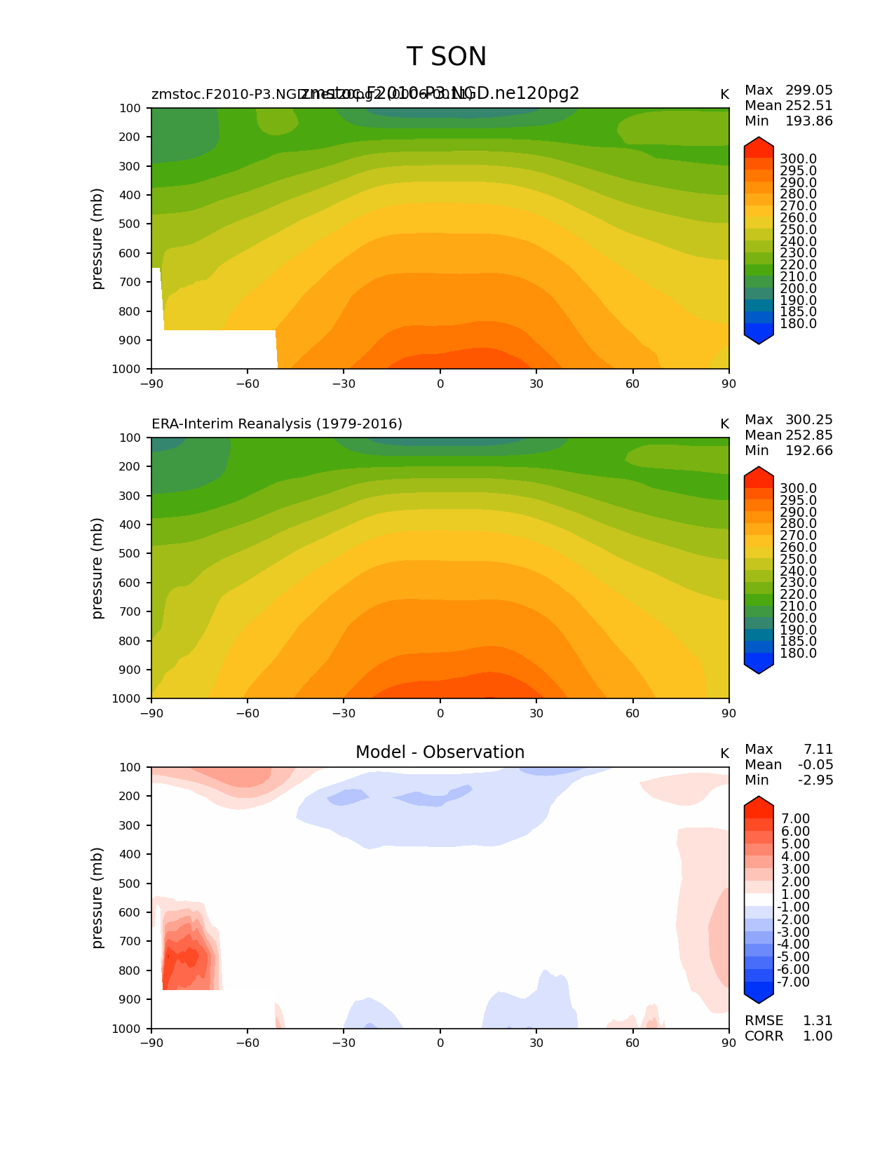 Use this command to recreate this image: | e3sm_diags zonal_mean_2d --no_viewer --case_id 'ERA-Interim' --sets 'zonal_mean_2d' --run_type 'model_vs_obs' --variables 'T' --seasons 'SON' --regions 'global' --regrid_tool 'esmf' --regrid_method 'conservative' --plevs '100.0' '115.47819846894582' '133.3521432163324' '153.9926526059492' '177.82794100389228' '205.3525026457146' '237.13737056616552' '273.8419634264361' '316.22776601683796' '365.1741272548377' '421.6965034285823' '486.9675251658631' '562.341325190349' '649.3816315762114' '749.8942093324558' '865.9643233600654' '1000.0' --main_title 'T SON' --backend 'mpl' --output_format 'png' --canvas_size_w '1212' --canvas_size_h '1628' --figsize '8.5' '11.0' --dpi '150' --arrows --contour_levels '180' '185' '190' '200' '210' '220' '230' '240' '250' '260' '270' '280' '290' '295' '300' --test_name 'zmstoc.F2010-P3.NGD.ne120pg2' --test_title 'zmstoc.F2010-P3.NGD.ne120pg2' --test_colormap 'cet_rainbow.rgb' --ref_name 'ERA-Interim' --reference_name 'ERA-Interim Reanalysis' --reference_colormap 'cet_rainbow.rgb' --diff_title 'Model - Observation' --diff_colormap 'diverging_bwr.rgb' --diff_levels '-7' '-6' '-5' '-4' '-3' '-2' '-1' '1' '2' '3' '4' '5' '6' '7' --num_workers '4' --granulate 'variables' 'seasons' 'regions' --selectors 'sets' 'seasons' --reference_data_path '/global/cfs/cdirs/e3sm/acme_diags/obs_for_e3sm_diags/climatology/' --test_data_path '/global/cscratch1/sd/xsongsio/E3SM_simulations/zmstoc.F2010-P3.NGD.ne120pg2/diag/clim_rgr/6yr/' --results_dir '/global/cfs/cdirs/e3sm/www/xsongsio/zmstoc.F2010-P3.NGD.ne120pg2/6yr' |