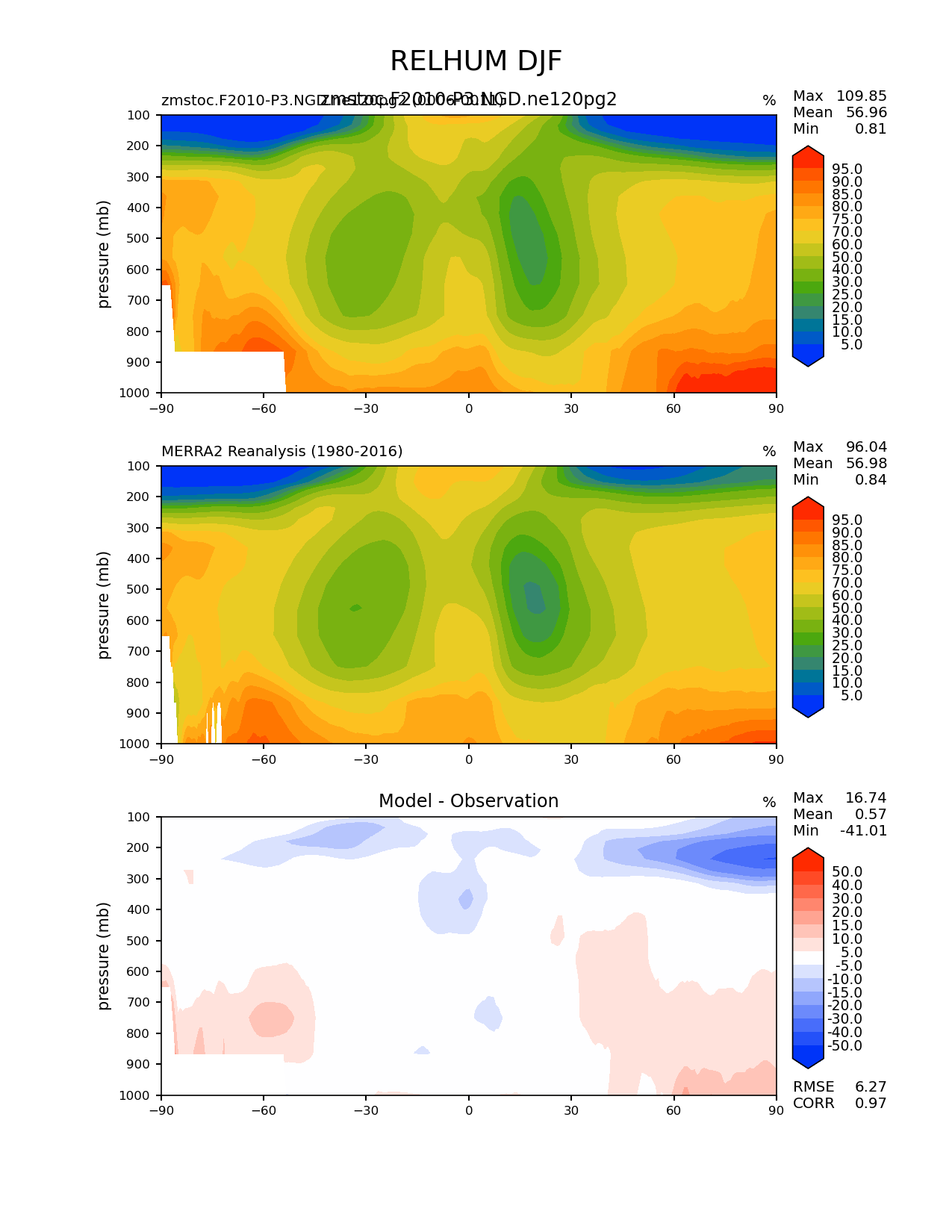 Use this command to recreate this image: | e3sm_diags zonal_mean_2d --no_viewer --case_id 'MERRA2' --sets 'zonal_mean_2d' --run_type 'model_vs_obs' --variables 'RELHUM' --seasons 'DJF' --regions 'global' --regrid_tool 'esmf' --regrid_method 'conservative' --plevs '100.0' '115.47819846894582' '133.3521432163324' '153.9926526059492' '177.82794100389228' '205.3525026457146' '237.13737056616552' '273.8419634264361' '316.22776601683796' '365.1741272548377' '421.6965034285823' '486.9675251658631' '562.341325190349' '649.3816315762114' '749.8942093324558' '865.9643233600654' '1000.0' --main_title 'RELHUM DJF' --backend 'mpl' --output_format 'png' --canvas_size_w '1212' --canvas_size_h '1628' --figsize '8.5' '11.0' --dpi '150' --arrows --contour_levels '5' '10' '15' '20' '25' '30' '40' '50' '60' '70' '75' '80' '85' '90' '95' --test_name 'zmstoc.F2010-P3.NGD.ne120pg2' --test_title 'zmstoc.F2010-P3.NGD.ne120pg2' --test_colormap 'cet_rainbow.rgb' --ref_name 'MERRA2' --reference_name 'MERRA2 Reanalysis' --reference_colormap 'cet_rainbow.rgb' --diff_title 'Model - Observation' --diff_colormap 'diverging_bwr.rgb' --diff_levels '-50' '-40' '-30' '-20' '-15' '-10' '-5' '5' '10' '15' '20' '30' '40' '50' --num_workers '4' --granulate 'variables' 'seasons' 'regions' --selectors 'sets' 'seasons' --reference_data_path '/global/cfs/cdirs/e3sm/acme_diags/obs_for_e3sm_diags/climatology/' --test_data_path '/global/cscratch1/sd/xsongsio/E3SM_simulations/zmstoc.F2010-P3.NGD.ne120pg2/diag/clim_rgr/6yr/' --results_dir '/global/cfs/cdirs/e3sm/www/xsongsio/zmstoc.F2010-P3.NGD.ne120pg2/6yr' |