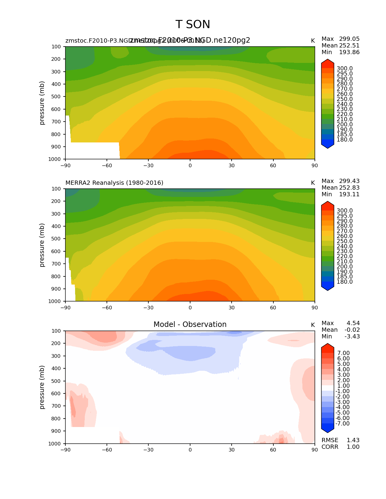 Use this command to recreate this image: | e3sm_diags zonal_mean_2d --no_viewer --case_id 'MERRA2' --sets 'zonal_mean_2d' --run_type 'model_vs_obs' --variables 'T' --seasons 'SON' --regions 'global' --regrid_tool 'esmf' --regrid_method 'conservative' --plevs '100.0' '115.47819846894582' '133.3521432163324' '153.9926526059492' '177.82794100389228' '205.3525026457146' '237.13737056616552' '273.8419634264361' '316.22776601683796' '365.1741272548377' '421.6965034285823' '486.9675251658631' '562.341325190349' '649.3816315762114' '749.8942093324558' '865.9643233600654' '1000.0' --main_title 'T SON' --backend 'mpl' --output_format 'png' --canvas_size_w '1212' --canvas_size_h '1628' --figsize '8.5' '11.0' --dpi '150' --arrows --contour_levels '180' '185' '190' '200' '210' '220' '230' '240' '250' '260' '270' '280' '290' '295' '300' --test_name 'zmstoc.F2010-P3.NGD.ne120pg2' --test_title 'zmstoc.F2010-P3.NGD.ne120pg2' --test_colormap 'cet_rainbow.rgb' --ref_name 'MERRA2' --reference_name 'MERRA2 Reanalysis' --reference_colormap 'cet_rainbow.rgb' --diff_title 'Model - Observation' --diff_colormap 'diverging_bwr.rgb' --diff_levels '-7' '-6' '-5' '-4' '-3' '-2' '-1' '1' '2' '3' '4' '5' '6' '7' --num_workers '4' --granulate 'variables' 'seasons' 'regions' --selectors 'sets' 'seasons' --reference_data_path '/global/cfs/cdirs/e3sm/acme_diags/obs_for_e3sm_diags/climatology/' --test_data_path '/global/cscratch1/sd/xsongsio/E3SM_simulations/zmstoc.F2010-P3.NGD.ne120pg2/diag/clim_rgr/6yr/' --results_dir '/global/cfs/cdirs/e3sm/www/xsongsio/zmstoc.F2010-P3.NGD.ne120pg2/6yr' |