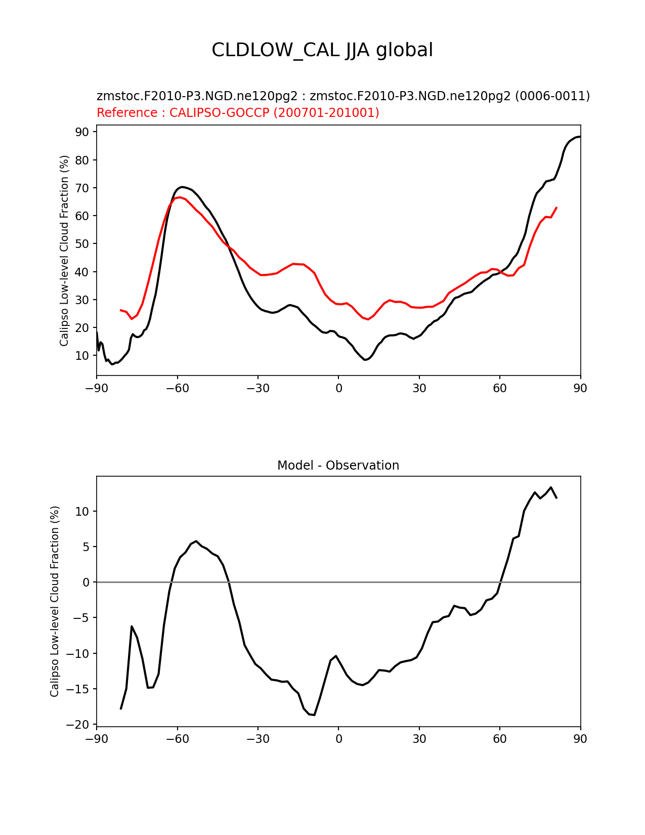 Use this command to recreate this image: | e3sm_diags zonal_mean_xy --no_viewer --case_id 'Cloud Calipso' --sets 'zonal_mean_xy' --run_type 'model_vs_obs' --variables 'CLDLOW_CAL' --seasons 'JJA' --regions 'global' --regrid_tool 'esmf' --regrid_method 'conservative' --main_title 'CLDLOW_CAL JJA global' --backend 'mpl' --output_format 'png' --canvas_size_w '1212' --canvas_size_h '1628' --figsize '8.5' '11.0' --dpi '150' --arrows --test_name 'zmstoc.F2010-P3.NGD.ne120pg2' --test_title 'zmstoc.F2010-P3.NGD.ne120pg2' --test_colormap 'cet_rainbow.rgb' --ref_name 'CALIPSOCOSP' --reference_name 'CALIPSO-GOCCP' --reference_colormap 'cet_rainbow.rgb' --diff_title 'Model - Observation' --diff_colormap 'diverging_bwr.rgb' --num_workers '4' --granulate 'variables' 'seasons' 'plevs' 'regions' --selectors 'sets' 'seasons' --reference_data_path '/global/cfs/cdirs/e3sm/acme_diags/obs_for_e3sm_diags/climatology/' --test_data_path '/global/cscratch1/sd/xsongsio/E3SM_simulations/zmstoc.F2010-P3.NGD.ne120pg2/diag/clim_rgr/6yr/' --results_dir '/global/cfs/cdirs/e3sm/www/xsongsio/zmstoc.F2010-P3.NGD.ne120pg2/6yr' |