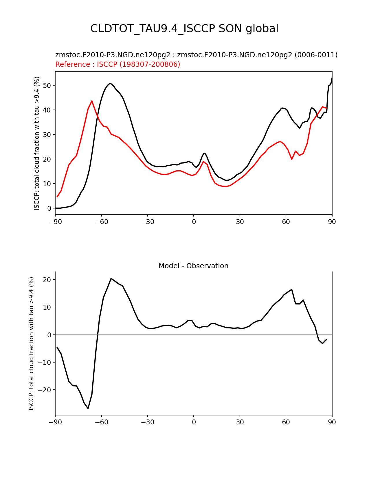 Use this command to recreate this image: | e3sm_diags zonal_mean_xy --no_viewer --case_id 'Cloud ISCCP' --sets 'zonal_mean_xy' --run_type 'model_vs_obs' --variables 'CLDTOT_TAU9.4_ISCCP' --seasons 'SON' --regions 'global' --regrid_tool 'esmf' --regrid_method 'conservative' --main_title 'CLDTOT_TAU9.4_ISCCP SON global' --backend 'mpl' --output_format 'png' --canvas_size_w '1212' --canvas_size_h '1628' --figsize '8.5' '11.0' --dpi '150' --arrows --test_name 'zmstoc.F2010-P3.NGD.ne120pg2' --test_title 'zmstoc.F2010-P3.NGD.ne120pg2' --test_colormap 'cet_rainbow.rgb' --ref_name 'ISCCPCOSP' --reference_name 'ISCCP' --reference_colormap 'cet_rainbow.rgb' --diff_title 'Model - Observation' --diff_colormap 'diverging_bwr.rgb' --num_workers '4' --granulate 'variables' 'seasons' 'plevs' 'regions' --selectors 'sets' 'seasons' --reference_data_path '/global/cfs/cdirs/e3sm/acme_diags/obs_for_e3sm_diags/climatology/' --test_data_path '/global/cscratch1/sd/xsongsio/E3SM_simulations/zmstoc.F2010-P3.NGD.ne120pg2/diag/clim_rgr/6yr/' --results_dir '/global/cfs/cdirs/e3sm/www/xsongsio/zmstoc.F2010-P3.NGD.ne120pg2/6yr' |