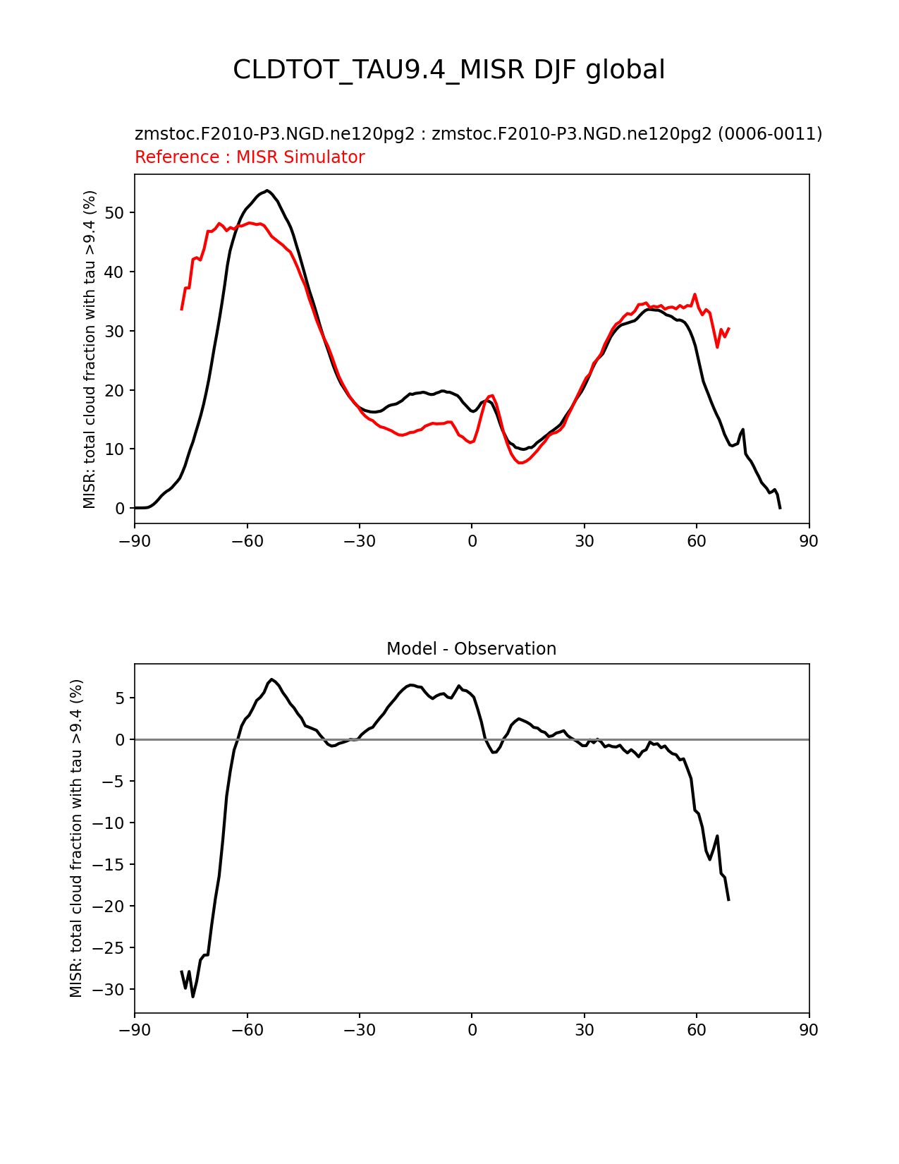 Use this command to recreate this image: | e3sm_diags zonal_mean_xy --no_viewer --case_id 'Cloud MISR' --sets 'zonal_mean_xy' --run_type 'model_vs_obs' --variables 'CLDTOT_TAU9.4_MISR' --seasons 'DJF' --regions 'global' --regrid_tool 'esmf' --regrid_method 'conservative' --main_title 'CLDTOT_TAU9.4_MISR DJF global' --backend 'mpl' --output_format 'png' --canvas_size_w '1212' --canvas_size_h '1628' --figsize '8.5' '11.0' --dpi '150' --arrows --test_name 'zmstoc.F2010-P3.NGD.ne120pg2' --test_title 'zmstoc.F2010-P3.NGD.ne120pg2' --test_colormap 'cet_rainbow.rgb' --ref_name 'MISRCOSP' --reference_name 'MISR Simulator' --reference_colormap 'cet_rainbow.rgb' --diff_title 'Model - Observation' --diff_colormap 'diverging_bwr.rgb' --num_workers '4' --granulate 'variables' 'seasons' 'plevs' 'regions' --selectors 'sets' 'seasons' --reference_data_path '/global/cfs/cdirs/e3sm/acme_diags/obs_for_e3sm_diags/climatology/' --test_data_path '/global/cscratch1/sd/xsongsio/E3SM_simulations/zmstoc.F2010-P3.NGD.ne120pg2/diag/clim_rgr/6yr/' --results_dir '/global/cfs/cdirs/e3sm/www/xsongsio/zmstoc.F2010-P3.NGD.ne120pg2/6yr' |