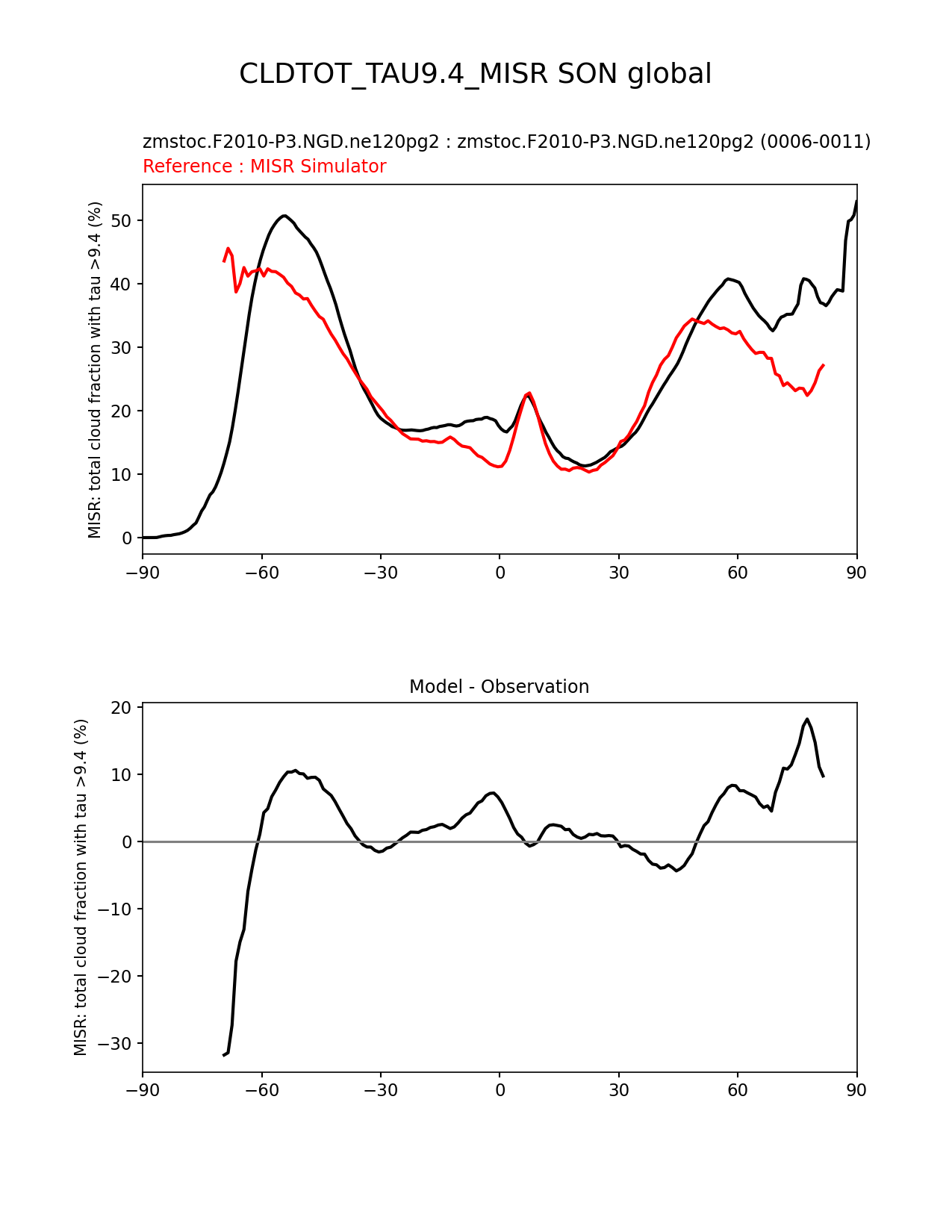 Use this command to recreate this image: | e3sm_diags zonal_mean_xy --no_viewer --case_id 'Cloud MISR' --sets 'zonal_mean_xy' --run_type 'model_vs_obs' --variables 'CLDTOT_TAU9.4_MISR' --seasons 'SON' --regions 'global' --regrid_tool 'esmf' --regrid_method 'conservative' --main_title 'CLDTOT_TAU9.4_MISR SON global' --backend 'mpl' --output_format 'png' --canvas_size_w '1212' --canvas_size_h '1628' --figsize '8.5' '11.0' --dpi '150' --arrows --test_name 'zmstoc.F2010-P3.NGD.ne120pg2' --test_title 'zmstoc.F2010-P3.NGD.ne120pg2' --test_colormap 'cet_rainbow.rgb' --ref_name 'MISRCOSP' --reference_name 'MISR Simulator' --reference_colormap 'cet_rainbow.rgb' --diff_title 'Model - Observation' --diff_colormap 'diverging_bwr.rgb' --num_workers '4' --granulate 'variables' 'seasons' 'plevs' 'regions' --selectors 'sets' 'seasons' --reference_data_path '/global/cfs/cdirs/e3sm/acme_diags/obs_for_e3sm_diags/climatology/' --test_data_path '/global/cscratch1/sd/xsongsio/E3SM_simulations/zmstoc.F2010-P3.NGD.ne120pg2/diag/clim_rgr/6yr/' --results_dir '/global/cfs/cdirs/e3sm/www/xsongsio/zmstoc.F2010-P3.NGD.ne120pg2/6yr' |