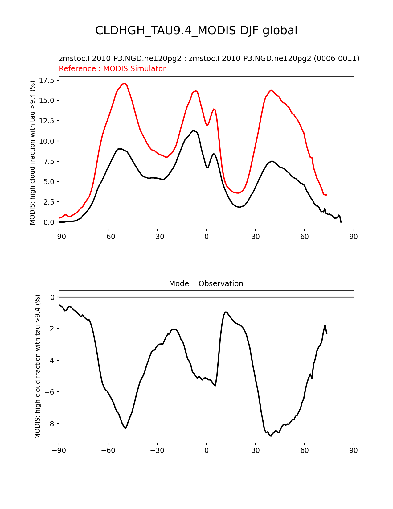 Use this command to recreate this image: | e3sm_diags zonal_mean_xy --no_viewer --case_id 'Cloud MODIS' --sets 'zonal_mean_xy' --run_type 'model_vs_obs' --variables 'CLDHGH_TAU9.4_MODIS' --seasons 'DJF' --regions 'global' --regrid_tool 'esmf' --regrid_method 'conservative' --main_title 'CLDHGH_TAU9.4_MODIS DJF global' --backend 'mpl' --output_format 'png' --canvas_size_w '1212' --canvas_size_h '1628' --figsize '8.5' '11.0' --dpi '150' --arrows --test_name 'zmstoc.F2010-P3.NGD.ne120pg2' --test_title 'zmstoc.F2010-P3.NGD.ne120pg2' --test_colormap 'cet_rainbow.rgb' --ref_name 'MODISCOSP' --reference_name 'MODIS Simulator' --reference_colormap 'cet_rainbow.rgb' --diff_title 'Model - Observation' --diff_colormap 'diverging_bwr.rgb' --num_workers '4' --granulate 'variables' 'seasons' 'plevs' 'regions' --selectors 'sets' 'seasons' --reference_data_path '/global/cfs/cdirs/e3sm/acme_diags/obs_for_e3sm_diags/climatology/' --test_data_path '/global/cscratch1/sd/xsongsio/E3SM_simulations/zmstoc.F2010-P3.NGD.ne120pg2/diag/clim_rgr/6yr/' --results_dir '/global/cfs/cdirs/e3sm/www/xsongsio/zmstoc.F2010-P3.NGD.ne120pg2/6yr' |