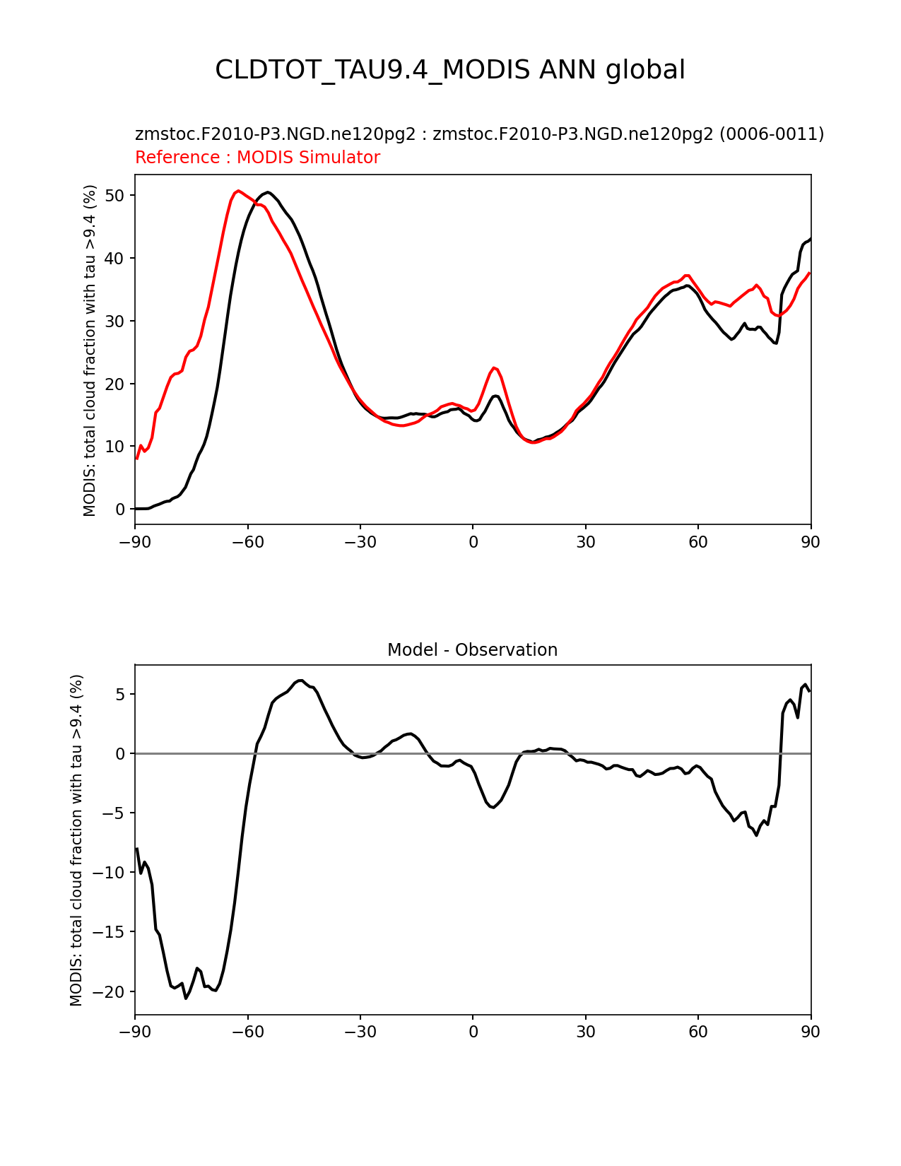 Use this command to recreate this image: | e3sm_diags zonal_mean_xy --no_viewer --case_id 'Cloud MODIS' --sets 'zonal_mean_xy' --run_type 'model_vs_obs' --variables 'CLDTOT_TAU9.4_MODIS' --seasons 'ANN' --regions 'global' --regrid_tool 'esmf' --regrid_method 'conservative' --main_title 'CLDTOT_TAU9.4_MODIS ANN global' --backend 'mpl' --output_format 'png' --canvas_size_w '1212' --canvas_size_h '1628' --figsize '8.5' '11.0' --dpi '150' --arrows --test_name 'zmstoc.F2010-P3.NGD.ne120pg2' --test_title 'zmstoc.F2010-P3.NGD.ne120pg2' --test_colormap 'cet_rainbow.rgb' --ref_name 'MODISCOSP' --reference_name 'MODIS Simulator' --reference_colormap 'cet_rainbow.rgb' --diff_title 'Model - Observation' --diff_colormap 'diverging_bwr.rgb' --num_workers '4' --granulate 'variables' 'seasons' 'plevs' 'regions' --selectors 'sets' 'seasons' --reference_data_path '/global/cfs/cdirs/e3sm/acme_diags/obs_for_e3sm_diags/climatology/' --test_data_path '/global/cscratch1/sd/xsongsio/E3SM_simulations/zmstoc.F2010-P3.NGD.ne120pg2/diag/clim_rgr/6yr/' --results_dir '/global/cfs/cdirs/e3sm/www/xsongsio/zmstoc.F2010-P3.NGD.ne120pg2/6yr' |
