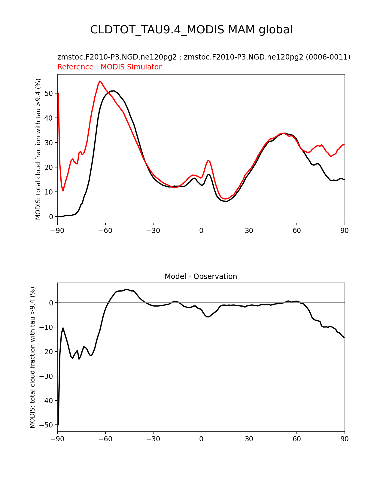 Use this command to recreate this image: | e3sm_diags zonal_mean_xy --no_viewer --case_id 'Cloud MODIS' --sets 'zonal_mean_xy' --run_type 'model_vs_obs' --variables 'CLDTOT_TAU9.4_MODIS' --seasons 'MAM' --regions 'global' --regrid_tool 'esmf' --regrid_method 'conservative' --main_title 'CLDTOT_TAU9.4_MODIS MAM global' --backend 'mpl' --output_format 'png' --canvas_size_w '1212' --canvas_size_h '1628' --figsize '8.5' '11.0' --dpi '150' --arrows --test_name 'zmstoc.F2010-P3.NGD.ne120pg2' --test_title 'zmstoc.F2010-P3.NGD.ne120pg2' --test_colormap 'cet_rainbow.rgb' --ref_name 'MODISCOSP' --reference_name 'MODIS Simulator' --reference_colormap 'cet_rainbow.rgb' --diff_title 'Model - Observation' --diff_colormap 'diverging_bwr.rgb' --num_workers '4' --granulate 'variables' 'seasons' 'plevs' 'regions' --selectors 'sets' 'seasons' --reference_data_path '/global/cfs/cdirs/e3sm/acme_diags/obs_for_e3sm_diags/climatology/' --test_data_path '/global/cscratch1/sd/xsongsio/E3SM_simulations/zmstoc.F2010-P3.NGD.ne120pg2/diag/clim_rgr/6yr/' --results_dir '/global/cfs/cdirs/e3sm/www/xsongsio/zmstoc.F2010-P3.NGD.ne120pg2/6yr' |