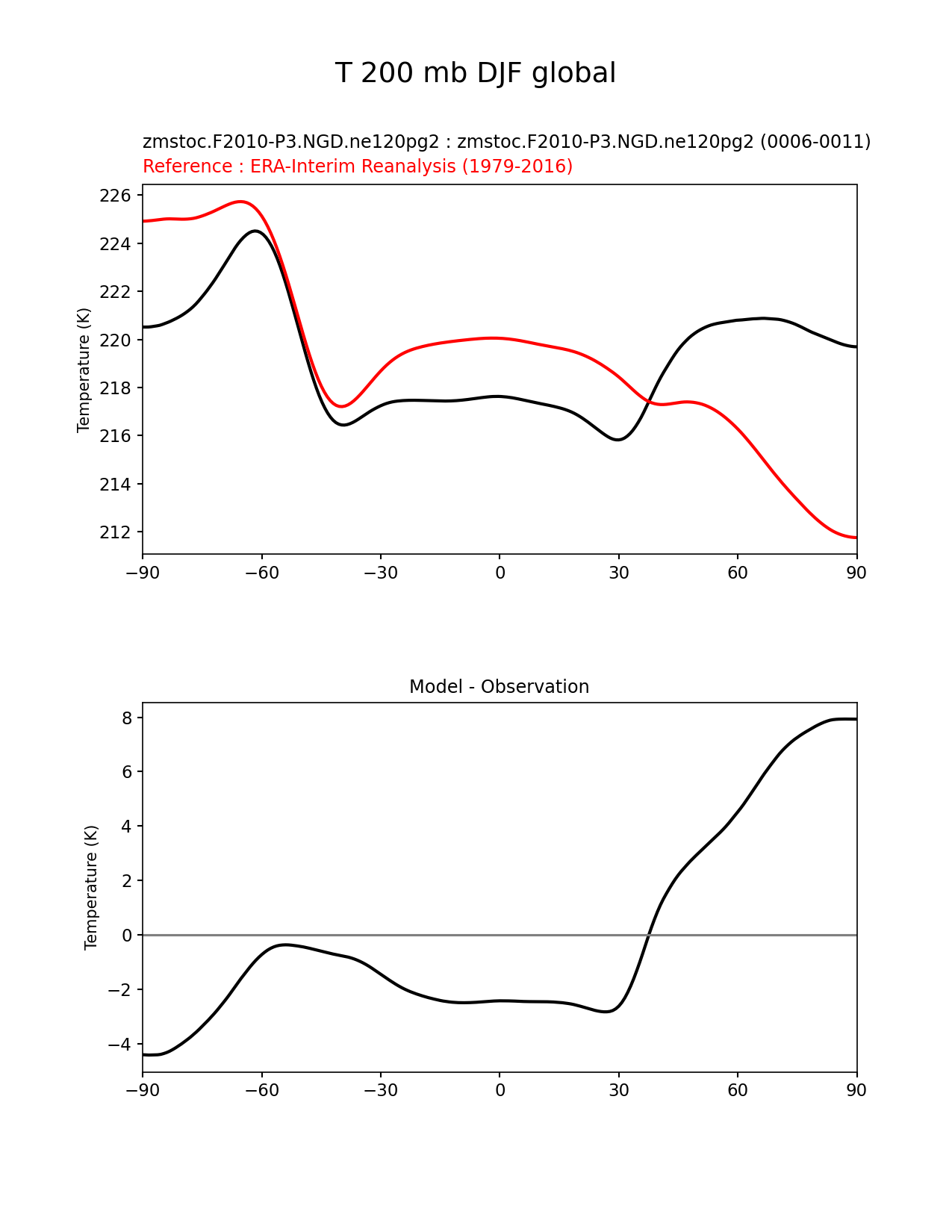 Use this command to recreate this image: | e3sm_diags zonal_mean_xy --no_viewer --case_id 'ERA-Interim' --sets 'zonal_mean_xy' --run_type 'model_vs_obs' --variables 'T' --seasons 'DJF' --regions 'global' --regrid_tool 'esmf' --regrid_method 'conservative' --plevs '200.0' --main_title 'T 200 mb DJF global' --backend 'mpl' --output_format 'png' --canvas_size_w '1212' --canvas_size_h '1628' --figsize '8.5' '11.0' --dpi '150' --arrows --test_name 'zmstoc.F2010-P3.NGD.ne120pg2' --test_title 'zmstoc.F2010-P3.NGD.ne120pg2' --test_colormap 'cet_rainbow.rgb' --ref_name 'ERA-Interim' --reference_name 'ERA-Interim Reanalysis' --reference_colormap 'cet_rainbow.rgb' --diff_title 'Model - Observation' --diff_colormap 'diverging_bwr.rgb' --num_workers '4' --granulate 'variables' 'seasons' 'plevs' 'regions' --selectors 'sets' 'seasons' --reference_data_path '/global/cfs/cdirs/e3sm/acme_diags/obs_for_e3sm_diags/climatology/' --test_data_path '/global/cscratch1/sd/xsongsio/E3SM_simulations/zmstoc.F2010-P3.NGD.ne120pg2/diag/clim_rgr/6yr/' --results_dir '/global/cfs/cdirs/e3sm/www/xsongsio/zmstoc.F2010-P3.NGD.ne120pg2/6yr' |