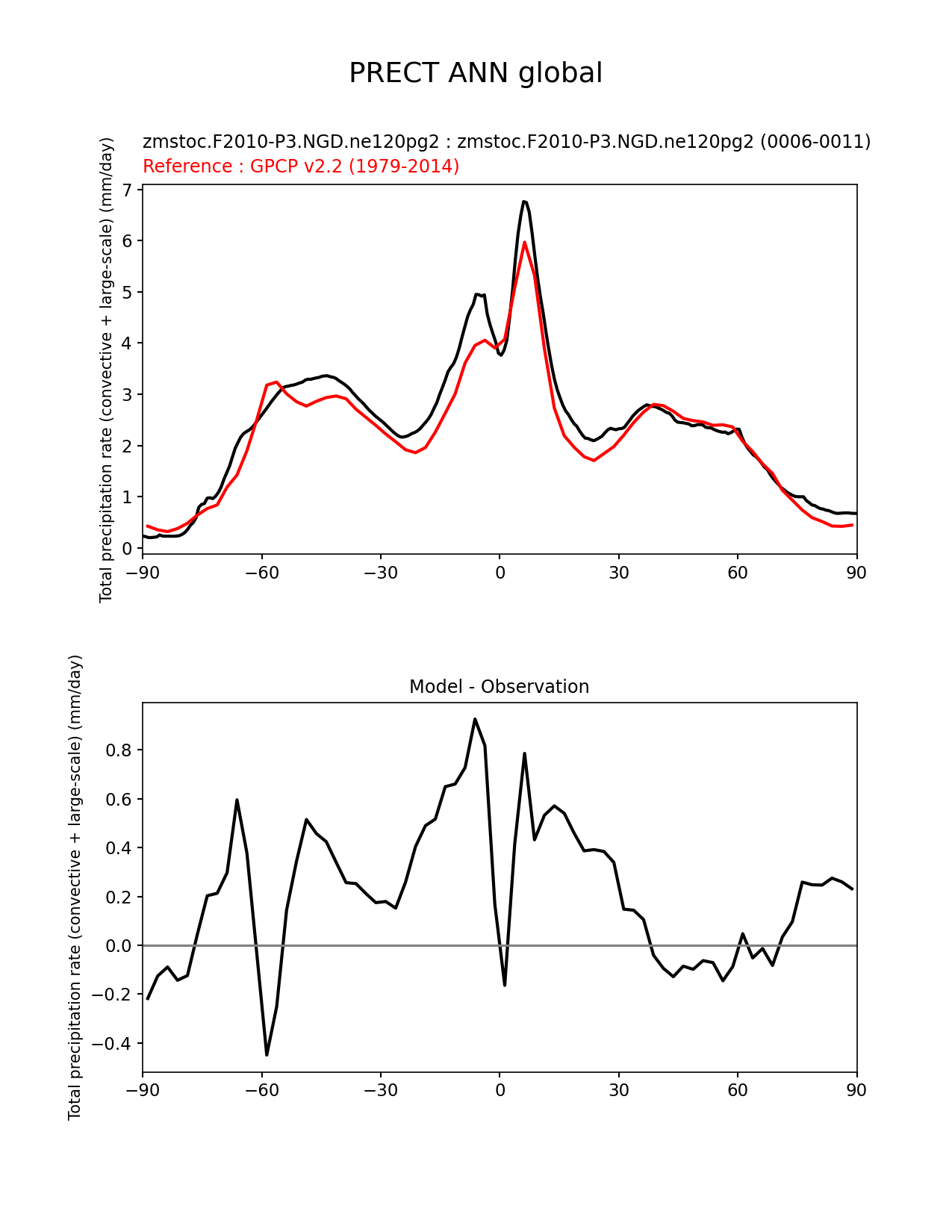Use this command to recreate this image: | e3sm_diags zonal_mean_xy --no_viewer --case_id 'GPCP_v2.2' --sets 'zonal_mean_xy' --run_type 'model_vs_obs' --variables 'PRECT' --seasons 'ANN' --regions 'global' --regrid_tool 'esmf' --regrid_method 'conservative' --main_title 'PRECT ANN global' --backend 'mpl' --output_format 'png' --canvas_size_w '1212' --canvas_size_h '1628' --figsize '8.5' '11.0' --dpi '150' --arrows --test_name 'zmstoc.F2010-P3.NGD.ne120pg2' --test_title 'zmstoc.F2010-P3.NGD.ne120pg2' --test_colormap 'cet_rainbow.rgb' --ref_name 'GPCP_v2.2' --reference_name 'GPCP v2.2' --reference_colormap 'cet_rainbow.rgb' --diff_title 'Model - Observation' --diff_colormap 'diverging_bwr.rgb' --num_workers '4' --granulate 'variables' 'seasons' 'plevs' 'regions' --selectors 'sets' 'seasons' --reference_data_path '/global/cfs/cdirs/e3sm/acme_diags/obs_for_e3sm_diags/climatology/' --test_data_path '/global/cscratch1/sd/xsongsio/E3SM_simulations/zmstoc.F2010-P3.NGD.ne120pg2/diag/clim_rgr/6yr/' --results_dir '/global/cfs/cdirs/e3sm/www/xsongsio/zmstoc.F2010-P3.NGD.ne120pg2/6yr' |