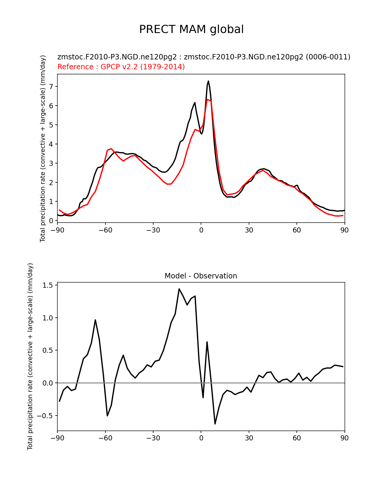 Use this command to recreate this image: | e3sm_diags zonal_mean_xy --no_viewer --case_id 'GPCP_v2.2' --sets 'zonal_mean_xy' --run_type 'model_vs_obs' --variables 'PRECT' --seasons 'MAM' --regions 'global' --regrid_tool 'esmf' --regrid_method 'conservative' --main_title 'PRECT MAM global' --backend 'mpl' --output_format 'png' --canvas_size_w '1212' --canvas_size_h '1628' --figsize '8.5' '11.0' --dpi '150' --arrows --test_name 'zmstoc.F2010-P3.NGD.ne120pg2' --test_title 'zmstoc.F2010-P3.NGD.ne120pg2' --test_colormap 'cet_rainbow.rgb' --ref_name 'GPCP_v2.2' --reference_name 'GPCP v2.2' --reference_colormap 'cet_rainbow.rgb' --diff_title 'Model - Observation' --diff_colormap 'diverging_bwr.rgb' --num_workers '4' --granulate 'variables' 'seasons' 'plevs' 'regions' --selectors 'sets' 'seasons' --reference_data_path '/global/cfs/cdirs/e3sm/acme_diags/obs_for_e3sm_diags/climatology/' --test_data_path '/global/cscratch1/sd/xsongsio/E3SM_simulations/zmstoc.F2010-P3.NGD.ne120pg2/diag/clim_rgr/6yr/' --results_dir '/global/cfs/cdirs/e3sm/www/xsongsio/zmstoc.F2010-P3.NGD.ne120pg2/6yr' |