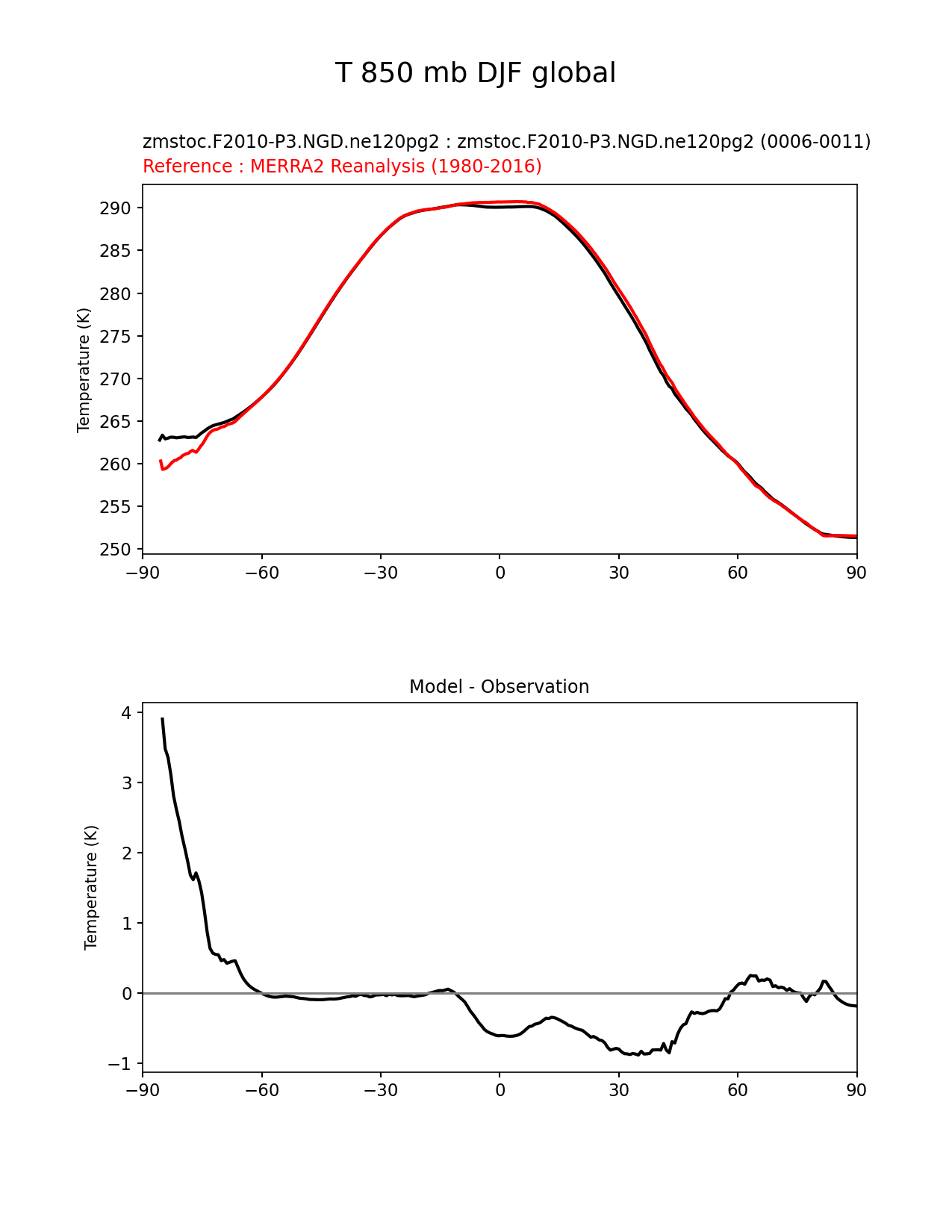 Use this command to recreate this image: | e3sm_diags zonal_mean_xy --no_viewer --case_id 'MERRA2' --sets 'zonal_mean_xy' --run_type 'model_vs_obs' --variables 'T' --seasons 'DJF' --regions 'global' --regrid_tool 'esmf' --regrid_method 'conservative' --plevs '850.0' --main_title 'T 850 mb DJF global' --backend 'mpl' --output_format 'png' --canvas_size_w '1212' --canvas_size_h '1628' --figsize '8.5' '11.0' --dpi '150' --arrows --test_name 'zmstoc.F2010-P3.NGD.ne120pg2' --test_title 'zmstoc.F2010-P3.NGD.ne120pg2' --test_colormap 'cet_rainbow.rgb' --ref_name 'MERRA2' --reference_name 'MERRA2 Reanalysis' --reference_colormap 'cet_rainbow.rgb' --diff_title 'Model - Observation' --diff_colormap 'diverging_bwr.rgb' --num_workers '4' --granulate 'variables' 'seasons' 'plevs' 'regions' --selectors 'sets' 'seasons' --reference_data_path '/global/cfs/cdirs/e3sm/acme_diags/obs_for_e3sm_diags/climatology/' --test_data_path '/global/cscratch1/sd/xsongsio/E3SM_simulations/zmstoc.F2010-P3.NGD.ne120pg2/diag/clim_rgr/6yr/' --results_dir '/global/cfs/cdirs/e3sm/www/xsongsio/zmstoc.F2010-P3.NGD.ne120pg2/6yr' |