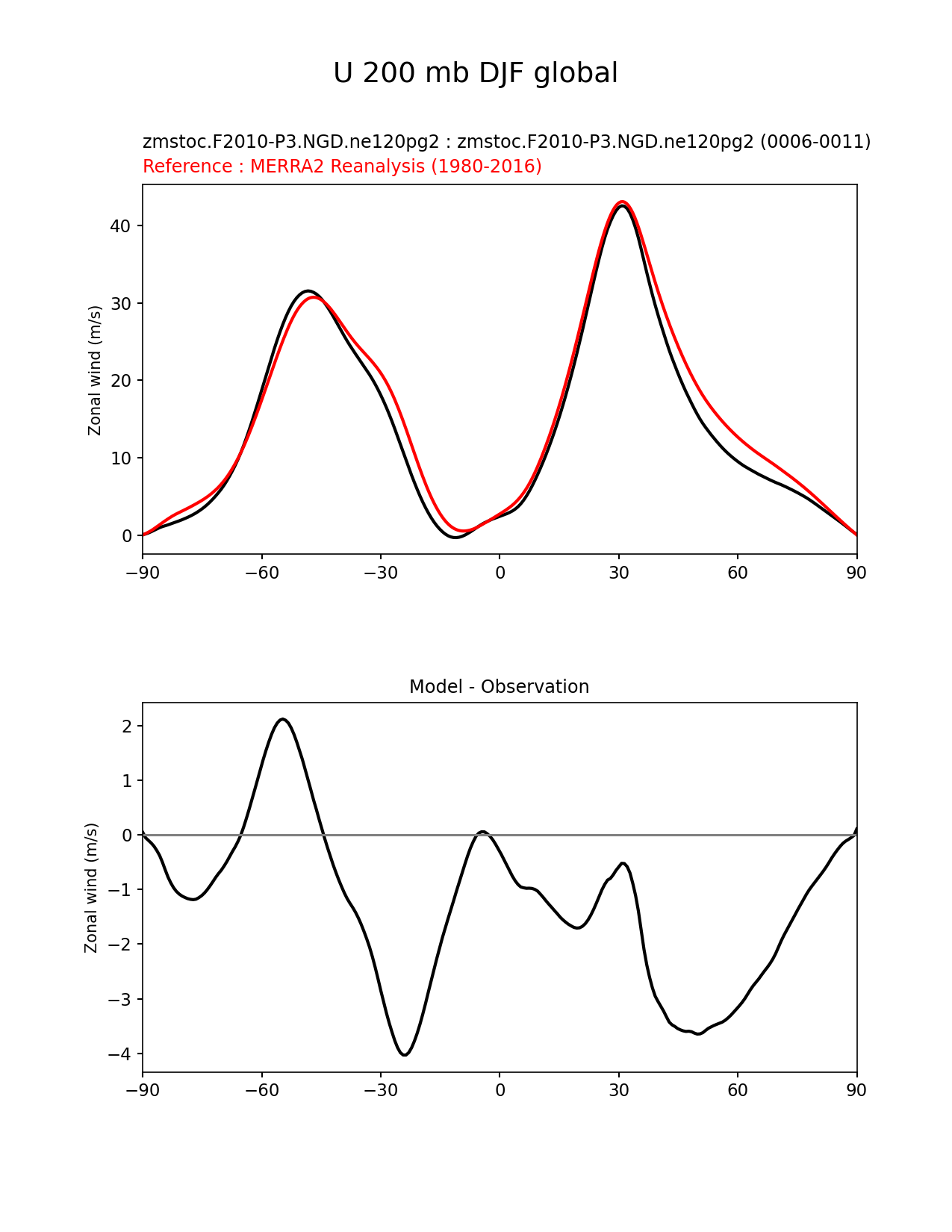 Use this command to recreate this image: | e3sm_diags zonal_mean_xy --no_viewer --case_id 'MERRA2' --sets 'zonal_mean_xy' --run_type 'model_vs_obs' --variables 'U' --seasons 'DJF' --regions 'global' --regrid_tool 'esmf' --regrid_method 'conservative' --plevs '200.0' --main_title 'U 200 mb DJF global' --backend 'mpl' --output_format 'png' --canvas_size_w '1212' --canvas_size_h '1628' --figsize '8.5' '11.0' --dpi '150' --arrows --test_name 'zmstoc.F2010-P3.NGD.ne120pg2' --test_title 'zmstoc.F2010-P3.NGD.ne120pg2' --test_colormap 'cet_rainbow.rgb' --ref_name 'MERRA2' --reference_name 'MERRA2 Reanalysis' --reference_colormap 'cet_rainbow.rgb' --diff_title 'Model - Observation' --diff_colormap 'diverging_bwr.rgb' --num_workers '4' --granulate 'variables' 'seasons' 'plevs' 'regions' --selectors 'sets' 'seasons' --reference_data_path '/global/cfs/cdirs/e3sm/acme_diags/obs_for_e3sm_diags/climatology/' --test_data_path '/global/cscratch1/sd/xsongsio/E3SM_simulations/zmstoc.F2010-P3.NGD.ne120pg2/diag/clim_rgr/6yr/' --results_dir '/global/cfs/cdirs/e3sm/www/xsongsio/zmstoc.F2010-P3.NGD.ne120pg2/6yr' |