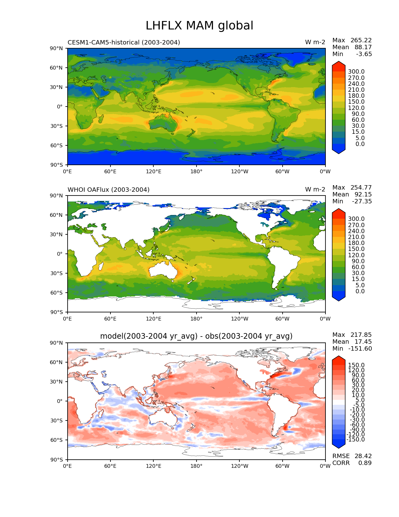 Use this command to recreate this image: | e3sm_diags --no_viewer --ref_timeseries_input --short_test_name 'CESM1-CAM5-historical' --contour_levels '0' '5' '15' '30' '60' '90' '120' '150' '180' '210' '240' '270' '300' --test_data_path '/global/project/projectdirs/acme/acme_diags/test_model_data_for_acme_diags/time-series/CESM1-CAM5_cmip/' --diff_levels '-150' '-120' '-90' '-60' '-30' '-20' '-10' '-5' '5' '10' '20' '30' '60' '90' '120' '150' --ref_end_yr 2004 --backend 'mpl' --canvas_size_h '1628' --reference_colormap 'cet_rainbow.rgb' --reference_data_path '/global/project/projectdirs/acme/acme_diags/obs_for_e3sm_diags/time-series/' --main_title 'LHFLX MAM global' --results_dir 'modTS_CMIP_vs_obs_2years' --regions 'global' --test_colormap 'cet_rainbow.rgb' --regrid_method 'conservative' --variables 'LHFLX' --figsize '8.5' '11.0' --ref_name 'OAFlux' --run_type 'model_vs_obs' --regrid_tool 'esmf' --num_workers '24' --ref_start_yr 2003 --reference_name 'WHOI OAFlux' --output_format 'png' --test_end_yr 2004 --test_start_yr 2003 --diff_colormap 'diverging_bwr.rgb' --granulate 'variables' 'seasons' 'regions' 'plevs' --seasons 'MAM' --test_timeseries_input --arrows --selectors 'sets' 'seasons' --diff_title 'model(2003-2004 yr_avg) - obs(2003-2004 yr_avg)' --case_id 'WHOI-OAFlux' --sets 'lat_lon' --canvas_size_w '1212' --multiprocessing --dpi '150' |