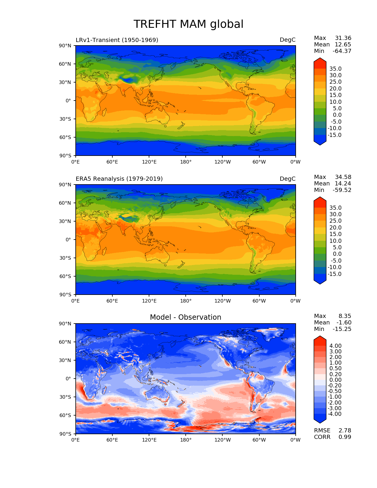 Use this command to recreate this image: | e3sm_diags lat_lon --no_viewer --case_id 'ERA5' --sets 'lat_lon' --run_type 'model_vs_obs' --variables 'TREFHT' --seasons 'MAM' --regions 'global' --regrid_tool 'esmf' --regrid_method 'conservative' --main_title 'TREFHT MAM global' --backend 'mpl' --output_format 'png' --canvas_size_w '1212' --canvas_size_h '1628' --figsize '8.5' '11.0' --dpi '150' --arrows --contour_levels '-15' '-10' '-5' '0' '5' '10' '15' '20' '25' '30' '35' --test_name '20210104.maint-1.0-A_WCYCL20TRS_CMIP6_LRtunedHR.ne30_oECv3_ICG.cori-knl.unc11' --short_test_name 'LRv1-Transient' --test_colormap 'cet_rainbow.rgb' --ref_name 'ERA5' --reference_name 'ERA5 Reanalysis' --reference_colormap 'cet_rainbow.rgb' --diff_title 'Model - Observation' --diff_colormap 'diverging_bwr.rgb' --diff_levels '-4' '-3' '-2' '-1' '-0.5' '-0.2' '0' '0.2' '0.5' '1' '2' '3' '4' --multiprocessing --num_workers '4' --granulate 'variables' 'seasons' 'plevs' 'regions' --selectors 'sets' 'seasons' --reference_data_path '/global/cfs/cdirs/e3sm/acme_diags/obs_for_e3sm_diags/climatology' --test_data_path '/global/cfs/cdirs/e3smdata/post-processing/20210104.maint-1.0-A_WCYCL20TRS_CMIP6_LRtunedHR.ne30_oECv3_ICG.cori-knl.unc11/post/atm/180x360_aave/clim/1950-1969' --results_dir '/global/cfs/cdirs/e3sm/www/zhang40/tests/LRv1-Transient_lat_lon_long' |