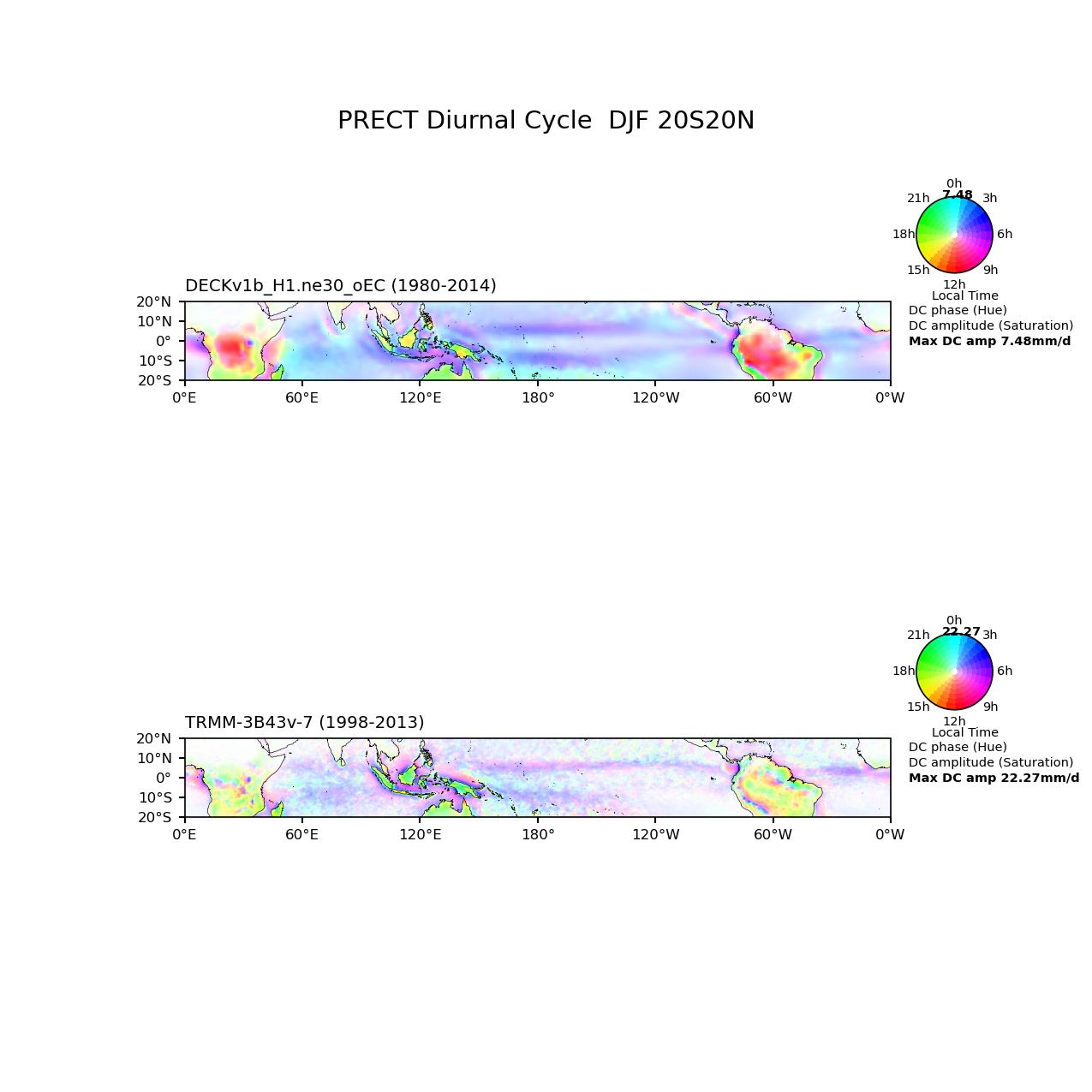 Use this command to recreate this image: | e3sm_diags diurnal_cycle --no_viewer --case_id 'TRMM-3B43v-7_3hr' --sets 'diurnal_cycle' --run_type 'model_vs_obs' --variables 'PRECT' --seasons 'DJF' --regions '20S20N' --regrid_tool 'esmf' --regrid_method 'conservative' --main_title 'PRECT Diurnal Cycle DJF 20S20N' --backend 'mpl' --output_format 'png' --canvas_size_w '1212' --canvas_size_h '1628' --figsize '8.5' '11.0' --dpi '150' --arrows --test_name '20180215.DECKv1b_H1.ne30_oEC.edison' --short_test_name 'DECKv1b_H1.ne30_oEC' --test_colormap 'cet_rainbow.rgb' --ref_name 'TRMM-3B43v-7_3hr' --reference_name 'TRMM-3B43v-7' --reference_colormap 'cet_rainbow.rgb' --diff_title 'Model - Observation' --diff_colormap 'diverging_bwr.rgb' --num_workers '4' --granulate 'variables' 'seasons' 'plevs' 'regions' --selectors 'sets' 'seasons' --reference_data_path '/global/cfs/cdirs/e3sm/acme_diags/obs_for_e3sm_diags/climatology' --test_data_path '/global/cfs/cdirs/e3sm/zhang40/postprocessing_for_e3sm_diags/diurnal_climo/20180215.DECKv1b_H1.ne30_oEC.edison/1980-2014/rgr' --results_dir '/global/cfs/cdirs/e3sm/www/zhang40/tests/v230_2sets' |