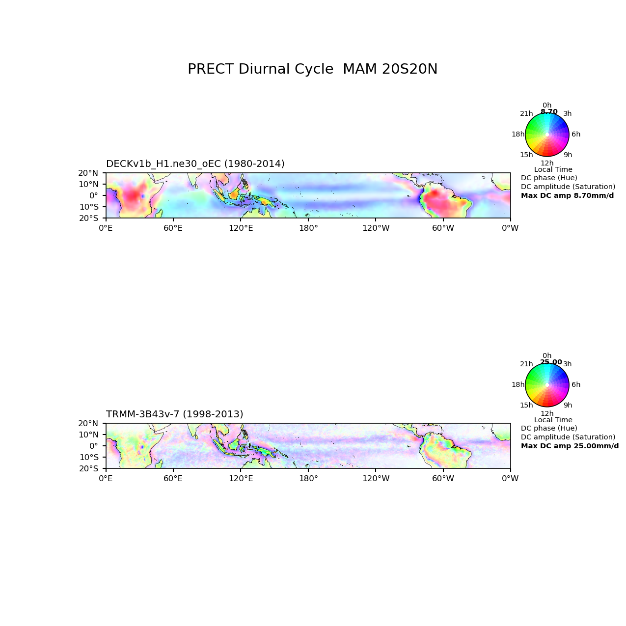 Use this command to recreate this image: | e3sm_diags diurnal_cycle --no_viewer --case_id 'TRMM-3B43v-7_3hr' --sets 'diurnal_cycle' --run_type 'model_vs_obs' --variables 'PRECT' --seasons 'MAM' --regions '20S20N' --regrid_tool 'esmf' --regrid_method 'conservative' --main_title 'PRECT Diurnal Cycle MAM 20S20N' --backend 'mpl' --output_format 'png' --canvas_size_w '1212' --canvas_size_h '1628' --figsize '8.5' '11.0' --dpi '150' --arrows --test_name '20180215.DECKv1b_H1.ne30_oEC.edison' --short_test_name 'DECKv1b_H1.ne30_oEC' --test_colormap 'cet_rainbow.rgb' --ref_name 'TRMM-3B43v-7_3hr' --reference_name 'TRMM-3B43v-7' --reference_colormap 'cet_rainbow.rgb' --diff_title 'Model - Observation' --diff_colormap 'diverging_bwr.rgb' --num_workers '4' --granulate 'variables' 'seasons' 'plevs' 'regions' --selectors 'sets' 'seasons' --reference_data_path '/global/cfs/cdirs/e3sm/acme_diags/obs_for_e3sm_diags/climatology' --test_data_path '/global/cfs/cdirs/e3sm/zhang40/postprocessing_for_e3sm_diags/diurnal_climo/20180215.DECKv1b_H1.ne30_oEC.edison/1980-2014/rgr' --results_dir '/global/cfs/cdirs/e3sm/www/zhang40/tests/v230_2sets' |