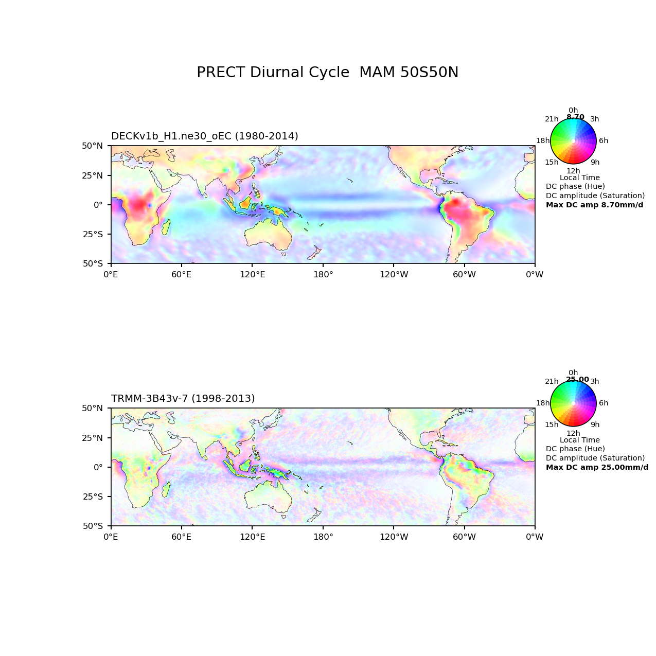 Use this command to recreate this image: | e3sm_diags diurnal_cycle --no_viewer --case_id 'TRMM-3B43v-7_3hr' --sets 'diurnal_cycle' --run_type 'model_vs_obs' --variables 'PRECT' --seasons 'MAM' --regions '50S50N' --regrid_tool 'esmf' --regrid_method 'conservative' --main_title 'PRECT Diurnal Cycle MAM 50S50N' --backend 'mpl' --output_format 'png' --canvas_size_w '1212' --canvas_size_h '1628' --figsize '8.5' '11.0' --dpi '150' --arrows --test_name '20180215.DECKv1b_H1.ne30_oEC.edison' --short_test_name 'DECKv1b_H1.ne30_oEC' --test_colormap 'cet_rainbow.rgb' --ref_name 'TRMM-3B43v-7_3hr' --reference_name 'TRMM-3B43v-7' --reference_colormap 'cet_rainbow.rgb' --diff_title 'Model - Observation' --diff_colormap 'diverging_bwr.rgb' --num_workers '4' --granulate 'variables' 'seasons' 'plevs' 'regions' --selectors 'sets' 'seasons' --reference_data_path '/global/cfs/cdirs/e3sm/acme_diags/obs_for_e3sm_diags/climatology' --test_data_path '/global/cfs/cdirs/e3sm/zhang40/postprocessing_for_e3sm_diags/diurnal_climo/20180215.DECKv1b_H1.ne30_oEC.edison/1980-2014/rgr' --results_dir '/global/cfs/cdirs/e3sm/www/zhang40/tests/v230_2sets' |