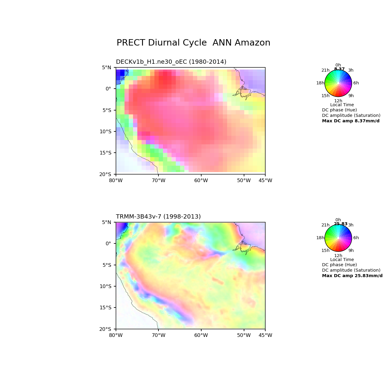 Use this command to recreate this image: | e3sm_diags diurnal_cycle --no_viewer --case_id 'TRMM-3B43v-7_3hr' --sets 'diurnal_cycle' --run_type 'model_vs_obs' --variables 'PRECT' --seasons 'ANN' --regions 'Amazon' --regrid_tool 'esmf' --regrid_method 'conservative' --main_title 'PRECT Diurnal Cycle ANN Amazon' --backend 'mpl' --output_format 'png' --canvas_size_w '1212' --canvas_size_h '1628' --figsize '8.5' '11.0' --dpi '150' --arrows --test_name '20180215.DECKv1b_H1.ne30_oEC.edison' --short_test_name 'DECKv1b_H1.ne30_oEC' --test_colormap 'cet_rainbow.rgb' --ref_name 'TRMM-3B43v-7_3hr' --reference_name 'TRMM-3B43v-7' --reference_colormap 'cet_rainbow.rgb' --diff_title 'Model - Observation' --diff_colormap 'diverging_bwr.rgb' --num_workers '4' --granulate 'variables' 'seasons' 'plevs' 'regions' --selectors 'sets' 'seasons' --reference_data_path '/global/cfs/cdirs/e3sm/acme_diags/obs_for_e3sm_diags/climatology' --test_data_path '/global/cfs/cdirs/e3sm/zhang40/postprocessing_for_e3sm_diags/diurnal_climo/20180215.DECKv1b_H1.ne30_oEC.edison/1980-2014/rgr' --results_dir '/global/cfs/cdirs/e3sm/www/zhang40/tests/v230_2sets' |