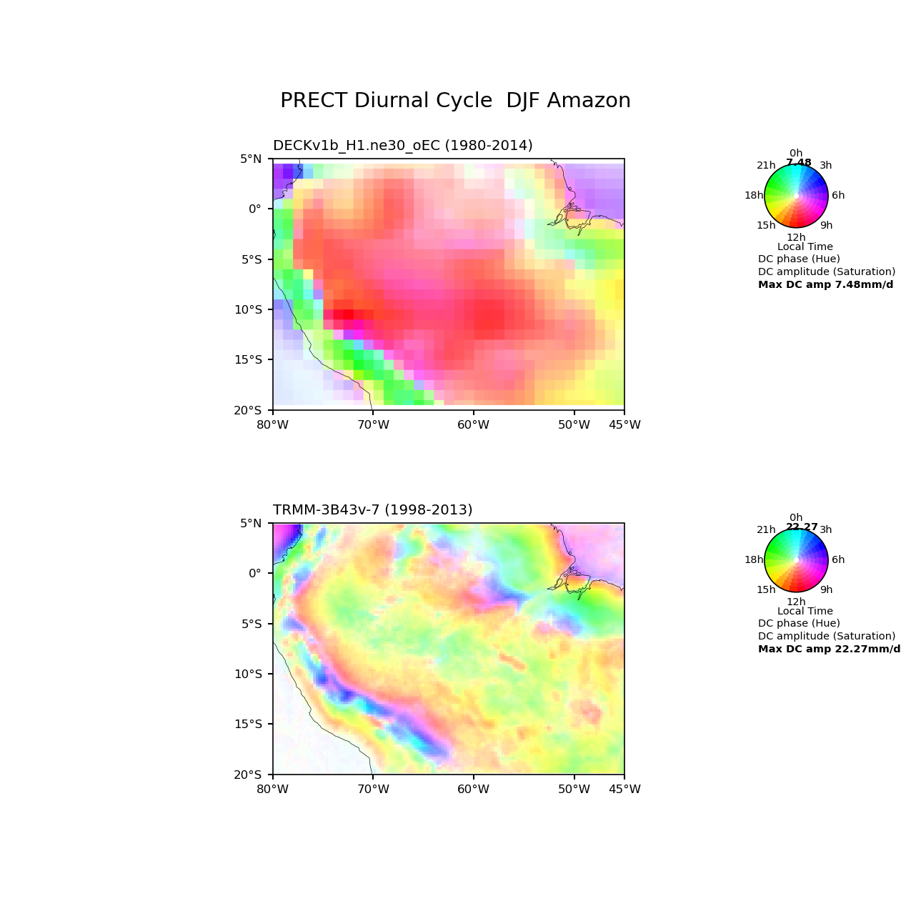 Use this command to recreate this image: | e3sm_diags diurnal_cycle --no_viewer --case_id 'TRMM-3B43v-7_3hr' --sets 'diurnal_cycle' --run_type 'model_vs_obs' --variables 'PRECT' --seasons 'DJF' --regions 'Amazon' --regrid_tool 'esmf' --regrid_method 'conservative' --main_title 'PRECT Diurnal Cycle DJF Amazon' --backend 'mpl' --output_format 'png' --canvas_size_w '1212' --canvas_size_h '1628' --figsize '8.5' '11.0' --dpi '150' --arrows --test_name '20180215.DECKv1b_H1.ne30_oEC.edison' --short_test_name 'DECKv1b_H1.ne30_oEC' --test_colormap 'cet_rainbow.rgb' --ref_name 'TRMM-3B43v-7_3hr' --reference_name 'TRMM-3B43v-7' --reference_colormap 'cet_rainbow.rgb' --diff_title 'Model - Observation' --diff_colormap 'diverging_bwr.rgb' --num_workers '4' --granulate 'variables' 'seasons' 'plevs' 'regions' --selectors 'sets' 'seasons' --reference_data_path '/global/cfs/cdirs/e3sm/acme_diags/obs_for_e3sm_diags/climatology' --test_data_path '/global/cfs/cdirs/e3sm/zhang40/postprocessing_for_e3sm_diags/diurnal_climo/20180215.DECKv1b_H1.ne30_oEC.edison/1980-2014/rgr' --results_dir '/global/cfs/cdirs/e3sm/www/zhang40/tests/v230_2sets' |