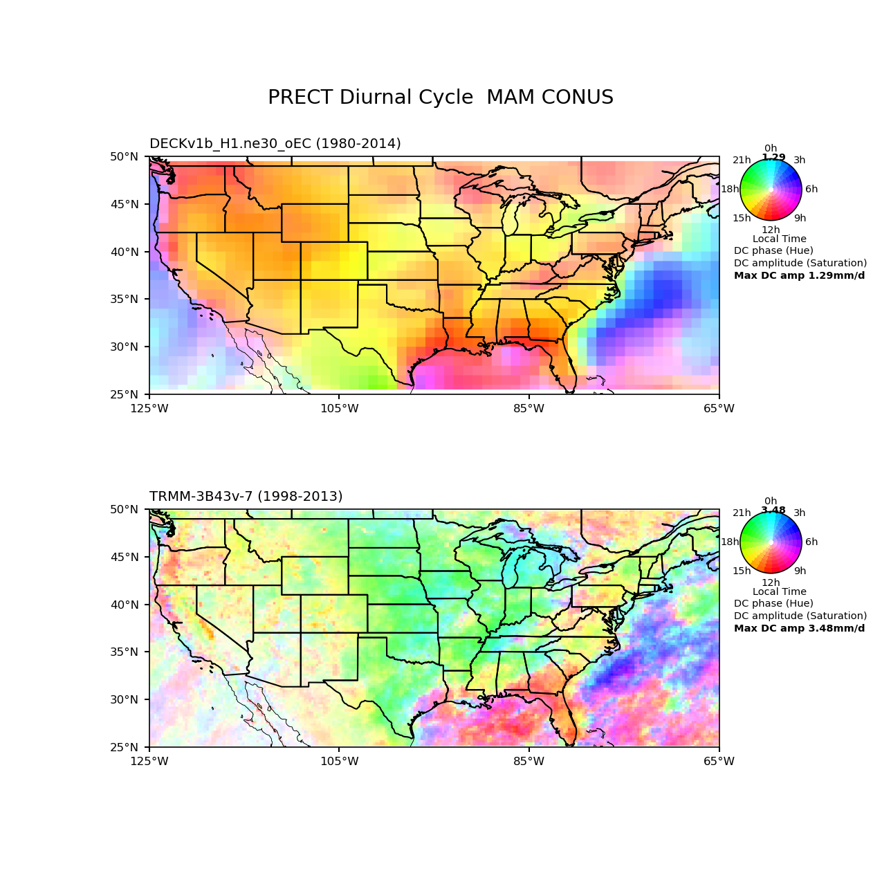 Use this command to recreate this image: | e3sm_diags diurnal_cycle --no_viewer --case_id 'TRMM-3B43v-7_3hr' --sets 'diurnal_cycle' --run_type 'model_vs_obs' --variables 'PRECT' --seasons 'MAM' --regions 'CONUS' --regrid_tool 'esmf' --regrid_method 'conservative' --main_title 'PRECT Diurnal Cycle MAM CONUS' --backend 'mpl' --output_format 'png' --canvas_size_w '1212' --canvas_size_h '1628' --figsize '8.5' '11.0' --dpi '150' --arrows --test_name '20180215.DECKv1b_H1.ne30_oEC.edison' --short_test_name 'DECKv1b_H1.ne30_oEC' --test_colormap 'cet_rainbow.rgb' --ref_name 'TRMM-3B43v-7_3hr' --reference_name 'TRMM-3B43v-7' --reference_colormap 'cet_rainbow.rgb' --diff_title 'Model - Observation' --diff_colormap 'diverging_bwr.rgb' --num_workers '4' --granulate 'variables' 'seasons' 'plevs' 'regions' --selectors 'sets' 'seasons' --reference_data_path '/global/cfs/cdirs/e3sm/acme_diags/obs_for_e3sm_diags/climatology' --test_data_path '/global/cfs/cdirs/e3sm/zhang40/postprocessing_for_e3sm_diags/diurnal_climo/20180215.DECKv1b_H1.ne30_oEC.edison/1980-2014/rgr' --results_dir '/global/cfs/cdirs/e3sm/www/zhang40/tests/v230_2sets' |