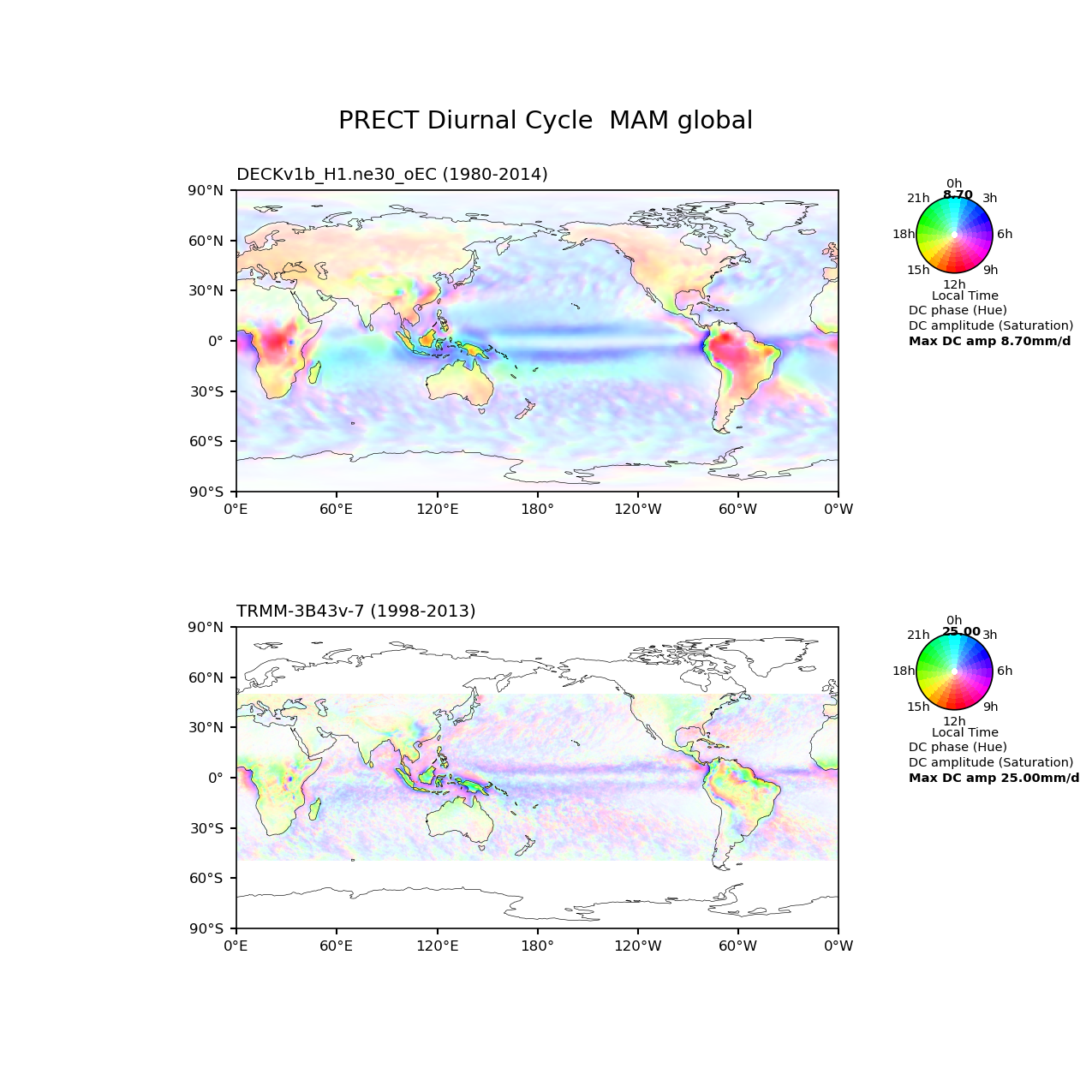 Use this command to recreate this image: | e3sm_diags diurnal_cycle --no_viewer --case_id 'TRMM-3B43v-7_3hr' --sets 'diurnal_cycle' --run_type 'model_vs_obs' --variables 'PRECT' --seasons 'MAM' --regions 'global' --regrid_tool 'esmf' --regrid_method 'conservative' --main_title 'PRECT Diurnal Cycle MAM global' --backend 'mpl' --output_format 'png' --canvas_size_w '1212' --canvas_size_h '1628' --figsize '8.5' '11.0' --dpi '150' --arrows --test_name '20180215.DECKv1b_H1.ne30_oEC.edison' --short_test_name 'DECKv1b_H1.ne30_oEC' --test_colormap 'cet_rainbow.rgb' --ref_name 'TRMM-3B43v-7_3hr' --reference_name 'TRMM-3B43v-7' --reference_colormap 'cet_rainbow.rgb' --diff_title 'Model - Observation' --diff_colormap 'diverging_bwr.rgb' --num_workers '4' --granulate 'variables' 'seasons' 'plevs' 'regions' --selectors 'sets' 'seasons' --reference_data_path '/global/cfs/cdirs/e3sm/acme_diags/obs_for_e3sm_diags/climatology' --test_data_path '/global/cfs/cdirs/e3sm/zhang40/postprocessing_for_e3sm_diags/diurnal_climo/20180215.DECKv1b_H1.ne30_oEC.edison/1980-2014/rgr' --results_dir '/global/cfs/cdirs/e3sm/www/zhang40/tests/v230_2sets' |
