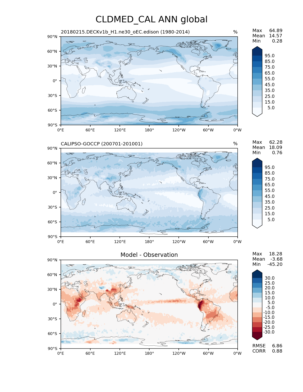 Use this command to recreate this image: | e3sm_diags lat_lon --no_viewer --case_id 'Cloud Calipso' --sets 'lat_lon' --run_type 'model_vs_obs' --variables 'CLDMED_CAL' --seasons 'ANN' --regions 'global' --regrid_tool 'esmf' --regrid_method 'conservative' --main_title 'CLDMED_CAL ANN global' --backend 'mpl' --output_format 'png' --canvas_size_w '1212' --canvas_size_h '1628' --figsize '8.5' '11.0' --dpi '150' --arrows --contour_levels '5' '15' '25' '35' '45' '55' '65' '75' '85' '95' --test_name '20180215.DECKv1b_H1.ne30_oEC.edison' --test_colormap 'Blues' --ref_name 'CALIPSOCOSP' --reference_name 'CALIPSO-GOCCP' --reference_colormap 'Blues' --diff_title 'Model - Observation' --diff_colormap 'RdBu' --diff_levels '-30' '-25' '-20' '-15' '-10' '-5' '5' '10' '15' '20' '25' '30' --multiprocessing --num_workers '15' --granulate 'variables' 'seasons' 'plevs' 'regions' --selectors 'sets' 'seasons' --reference_data_path '/global/cfs/cdirs/e3sm/acme_diags/obs_for_e3sm_diags/climatology' --test_data_path '/global/cfs/cdirs/e3sm/zhang40/postprocessing_for_e3sm_diags/climo/20180215.DECKv1b_H1.ne30_oEC.edison/1980-2014/rgr' --results_dir '/global/cfs/cdirs/e3sm/www/zhang40/tests/v230_enso' |