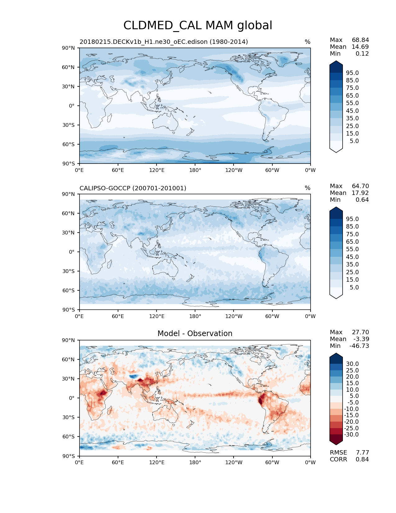 Use this command to recreate this image: | e3sm_diags lat_lon --no_viewer --case_id 'Cloud Calipso' --sets 'lat_lon' --run_type 'model_vs_obs' --variables 'CLDMED_CAL' --seasons 'MAM' --regions 'global' --regrid_tool 'esmf' --regrid_method 'conservative' --main_title 'CLDMED_CAL MAM global' --backend 'mpl' --output_format 'png' --canvas_size_w '1212' --canvas_size_h '1628' --figsize '8.5' '11.0' --dpi '150' --arrows --contour_levels '5' '15' '25' '35' '45' '55' '65' '75' '85' '95' --test_name '20180215.DECKv1b_H1.ne30_oEC.edison' --test_colormap 'Blues' --ref_name 'CALIPSOCOSP' --reference_name 'CALIPSO-GOCCP' --reference_colormap 'Blues' --diff_title 'Model - Observation' --diff_colormap 'RdBu' --diff_levels '-30' '-25' '-20' '-15' '-10' '-5' '5' '10' '15' '20' '25' '30' --multiprocessing --num_workers '15' --granulate 'variables' 'seasons' 'plevs' 'regions' --selectors 'sets' 'seasons' --reference_data_path '/global/cfs/cdirs/e3sm/acme_diags/obs_for_e3sm_diags/climatology' --test_data_path '/global/cfs/cdirs/e3sm/zhang40/postprocessing_for_e3sm_diags/climo/20180215.DECKv1b_H1.ne30_oEC.edison/1980-2014/rgr' --results_dir '/global/cfs/cdirs/e3sm/www/zhang40/tests/v230_enso' |