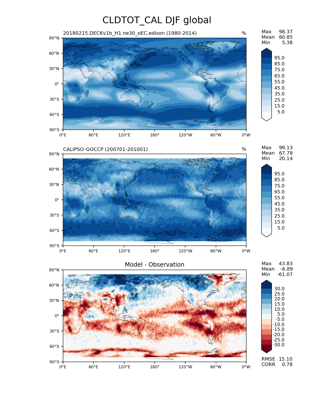 Use this command to recreate this image: | e3sm_diags lat_lon --no_viewer --case_id 'Cloud Calipso' --sets 'lat_lon' --run_type 'model_vs_obs' --variables 'CLDTOT_CAL' --seasons 'DJF' --regions 'global' --regrid_tool 'esmf' --regrid_method 'conservative' --main_title 'CLDTOT_CAL DJF global' --backend 'mpl' --output_format 'png' --canvas_size_w '1212' --canvas_size_h '1628' --figsize '8.5' '11.0' --dpi '150' --arrows --contour_levels '5' '15' '25' '35' '45' '55' '65' '75' '85' '95' --test_name '20180215.DECKv1b_H1.ne30_oEC.edison' --test_colormap 'Blues' --ref_name 'CALIPSOCOSP' --reference_name 'CALIPSO-GOCCP' --reference_colormap 'Blues' --diff_title 'Model - Observation' --diff_colormap 'RdBu' --diff_levels '-30' '-25' '-20' '-15' '-10' '-5' '5' '10' '15' '20' '25' '30' --multiprocessing --num_workers '15' --granulate 'variables' 'seasons' 'plevs' 'regions' --selectors 'sets' 'seasons' --reference_data_path '/global/cfs/cdirs/e3sm/acme_diags/obs_for_e3sm_diags/climatology' --test_data_path '/global/cfs/cdirs/e3sm/zhang40/postprocessing_for_e3sm_diags/climo/20180215.DECKv1b_H1.ne30_oEC.edison/1980-2014/rgr' --results_dir '/global/cfs/cdirs/e3sm/www/zhang40/tests/v230_enso' |