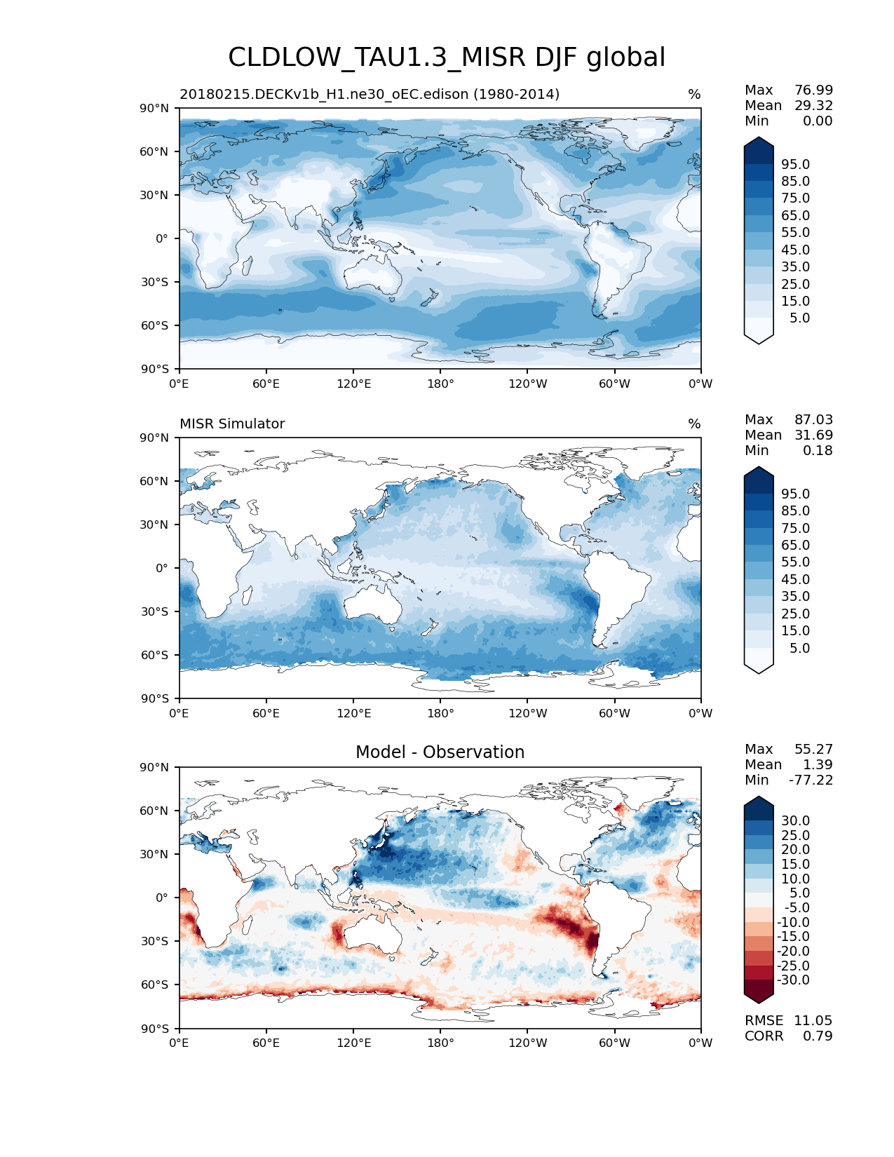 Use this command to recreate this image: | e3sm_diags lat_lon --no_viewer --case_id 'Cloud MISR' --sets 'lat_lon' --run_type 'model_vs_obs' --variables 'CLDLOW_TAU1.3_MISR' --seasons 'DJF' --regions 'global' --regrid_tool 'esmf' --regrid_method 'conservative' --main_title 'CLDLOW_TAU1.3_MISR DJF global' --backend 'mpl' --output_format 'png' --canvas_size_w '1212' --canvas_size_h '1628' --figsize '8.5' '11.0' --dpi '150' --arrows --contour_levels '5' '15' '25' '35' '45' '55' '65' '75' '85' '95' --test_name '20180215.DECKv1b_H1.ne30_oEC.edison' --test_colormap 'Blues' --ref_name 'MISRCOSP' --reference_name 'MISR Simulator' --reference_colormap 'Blues' --diff_title 'Model - Observation' --diff_colormap 'RdBu' --diff_levels '-30' '-25' '-20' '-15' '-10' '-5' '5' '10' '15' '20' '25' '30' --multiprocessing --num_workers '15' --granulate 'variables' 'seasons' 'plevs' 'regions' --selectors 'sets' 'seasons' --reference_data_path '/global/cfs/cdirs/e3sm/acme_diags/obs_for_e3sm_diags/climatology' --test_data_path '/global/cfs/cdirs/e3sm/zhang40/postprocessing_for_e3sm_diags/climo/20180215.DECKv1b_H1.ne30_oEC.edison/1980-2014/rgr' --results_dir '/global/cfs/cdirs/e3sm/www/zhang40/tests/v230_enso' |