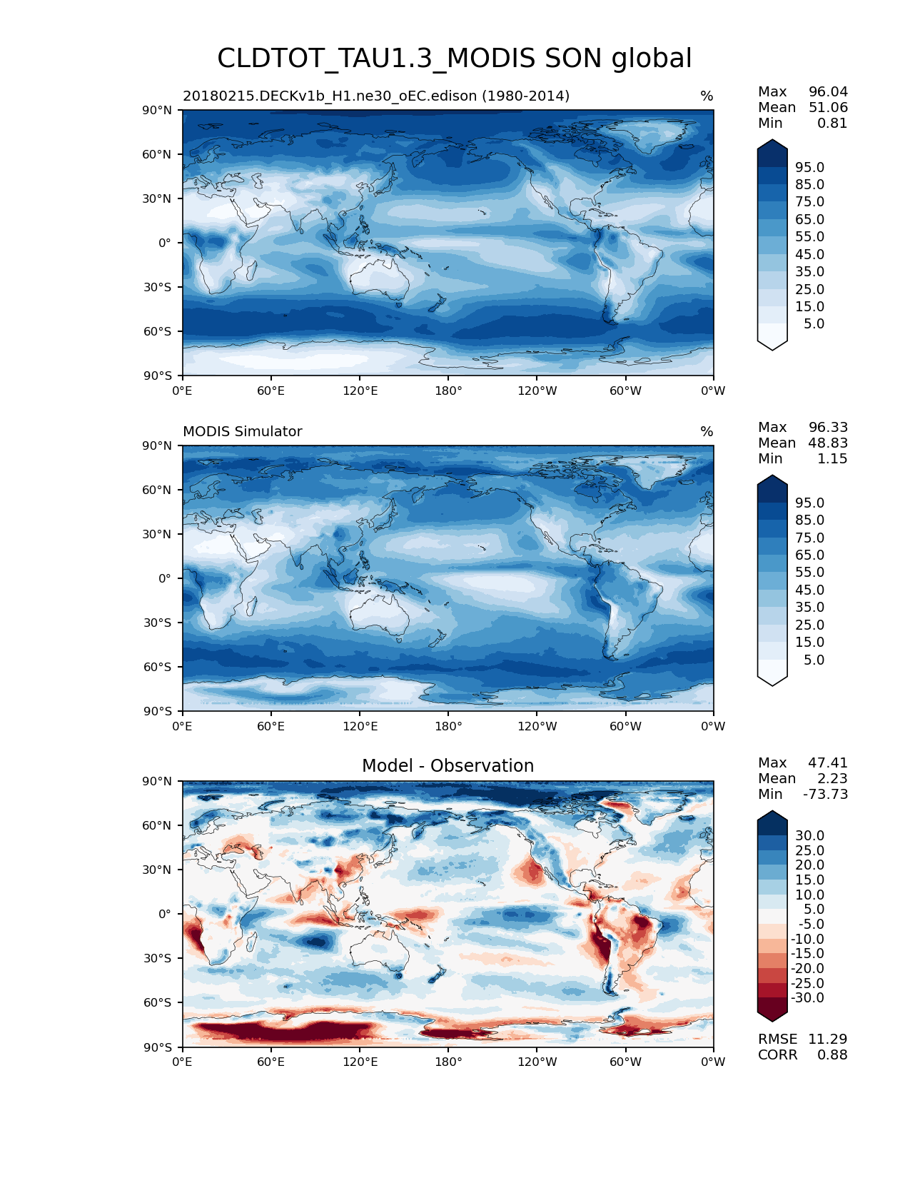 Use this command to recreate this image: | e3sm_diags lat_lon --no_viewer --case_id 'Cloud MODIS' --sets 'lat_lon' --run_type 'model_vs_obs' --variables 'CLDTOT_TAU1.3_MODIS' --seasons 'SON' --regions 'global' --regrid_tool 'esmf' --regrid_method 'conservative' --main_title 'CLDTOT_TAU1.3_MODIS SON global' --backend 'mpl' --output_format 'png' --canvas_size_w '1212' --canvas_size_h '1628' --figsize '8.5' '11.0' --dpi '150' --arrows --contour_levels '5' '15' '25' '35' '45' '55' '65' '75' '85' '95' --test_name '20180215.DECKv1b_H1.ne30_oEC.edison' --test_colormap 'Blues' --ref_name 'MODISCOSP' --reference_name 'MODIS Simulator' --reference_colormap 'Blues' --diff_title 'Model - Observation' --diff_colormap 'RdBu' --diff_levels '-30' '-25' '-20' '-15' '-10' '-5' '5' '10' '15' '20' '25' '30' --multiprocessing --num_workers '15' --granulate 'variables' 'seasons' 'plevs' 'regions' --selectors 'sets' 'seasons' --reference_data_path '/global/cfs/cdirs/e3sm/acme_diags/obs_for_e3sm_diags/climatology' --test_data_path '/global/cfs/cdirs/e3sm/zhang40/postprocessing_for_e3sm_diags/climo/20180215.DECKv1b_H1.ne30_oEC.edison/1980-2014/rgr' --results_dir '/global/cfs/cdirs/e3sm/www/zhang40/tests/v230_enso' |