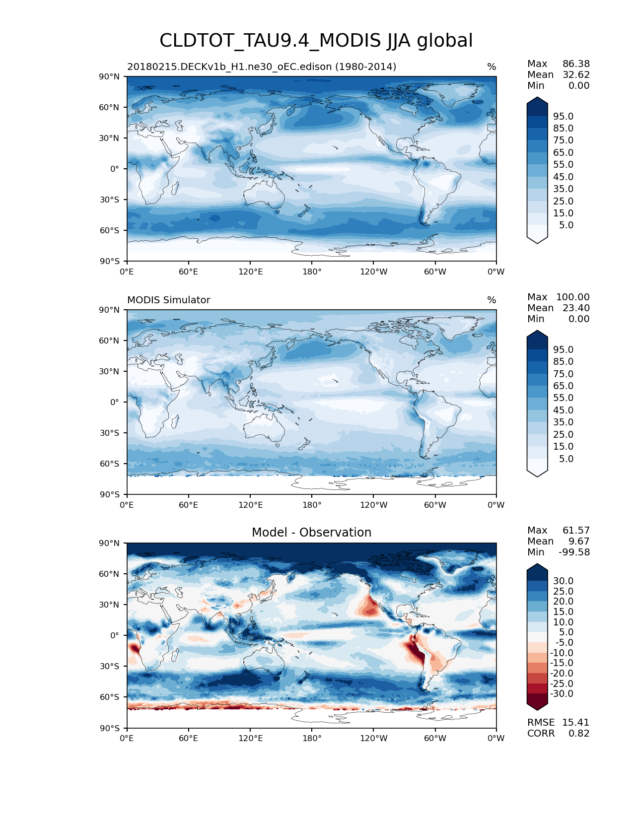 Use this command to recreate this image: | e3sm_diags lat_lon --no_viewer --case_id 'Cloud MODIS' --sets 'lat_lon' --run_type 'model_vs_obs' --variables 'CLDTOT_TAU9.4_MODIS' --seasons 'JJA' --regions 'global' --regrid_tool 'esmf' --regrid_method 'conservative' --main_title 'CLDTOT_TAU9.4_MODIS JJA global' --backend 'mpl' --output_format 'png' --canvas_size_w '1212' --canvas_size_h '1628' --figsize '8.5' '11.0' --dpi '150' --arrows --contour_levels '5' '15' '25' '35' '45' '55' '65' '75' '85' '95' --test_name '20180215.DECKv1b_H1.ne30_oEC.edison' --test_colormap 'Blues' --ref_name 'MODISCOSP' --reference_name 'MODIS Simulator' --reference_colormap 'Blues' --diff_title 'Model - Observation' --diff_colormap 'RdBu' --diff_levels '-30' '-25' '-20' '-15' '-10' '-5' '5' '10' '15' '20' '25' '30' --multiprocessing --num_workers '15' --granulate 'variables' 'seasons' 'plevs' 'regions' --selectors 'sets' 'seasons' --reference_data_path '/global/cfs/cdirs/e3sm/acme_diags/obs_for_e3sm_diags/climatology' --test_data_path '/global/cfs/cdirs/e3sm/zhang40/postprocessing_for_e3sm_diags/climo/20180215.DECKv1b_H1.ne30_oEC.edison/1980-2014/rgr' --results_dir '/global/cfs/cdirs/e3sm/www/zhang40/tests/v230_enso' |