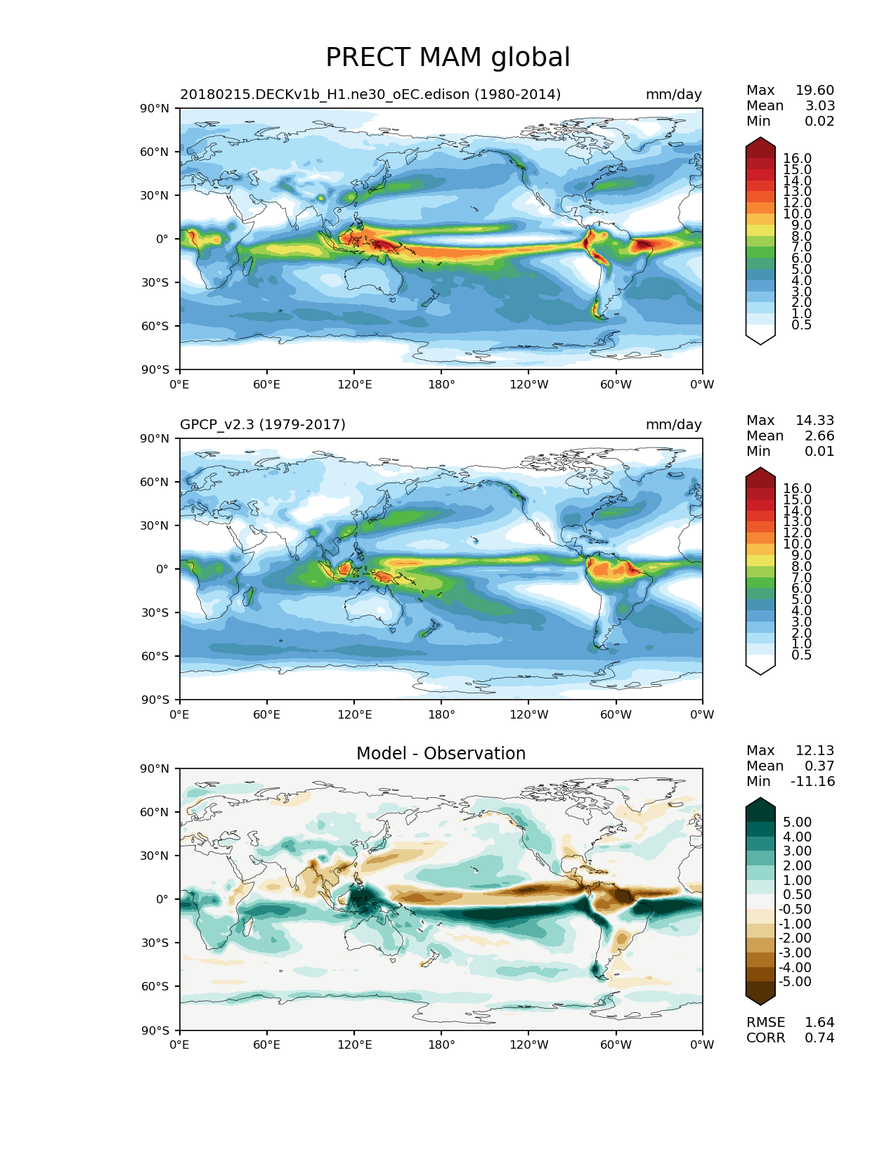 Use this command to recreate this image: | e3sm_diags lat_lon --no_viewer --case_id 'GPCP_v2.3' --sets 'lat_lon' --run_type 'model_vs_obs' --variables 'PRECT' --seasons 'MAM' --regions 'global' --regrid_tool 'esmf' --regrid_method 'conservative' --main_title 'PRECT MAM global' --backend 'mpl' --output_format 'png' --canvas_size_w '1212' --canvas_size_h '1628' --figsize '8.5' '11.0' --dpi '150' --arrows --contour_levels '0.5' '1' '2' '3' '4' '5' '6' '7' '8' '9' '10' '12' '13' '14' '15' '16' --test_name '20180215.DECKv1b_H1.ne30_oEC.edison' --test_colormap 'WhiteBlueGreenYellowRed.rgb' --ref_name 'GPCP_v2.3' --reference_name 'GPCP_v2.3' --reference_colormap 'WhiteBlueGreenYellowRed.rgb' --diff_title 'Model - Observation' --diff_colormap 'BrBG' --diff_levels '-5' '-4' '-3' '-2' '-1' '-0.5' '0.5' '1' '2' '3' '4' '5' --multiprocessing --num_workers '15' --granulate 'variables' 'seasons' 'plevs' 'regions' --selectors 'sets' 'seasons' --reference_data_path '/global/cfs/cdirs/e3sm/acme_diags/obs_for_e3sm_diags/climatology' --test_data_path '/global/cfs/cdirs/e3sm/zhang40/postprocessing_for_e3sm_diags/climo/20180215.DECKv1b_H1.ne30_oEC.edison/1980-2014/rgr' --results_dir '/global/cfs/cdirs/e3sm/www/zhang40/tests/v230_enso' |