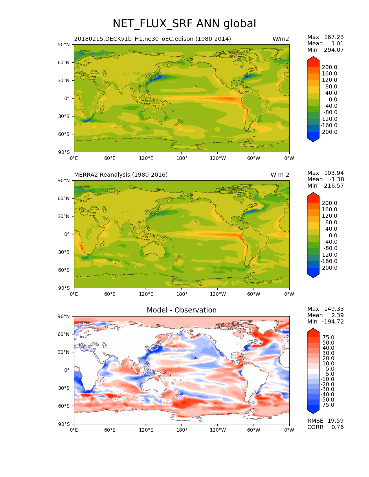 Use this command to recreate this image: | e3sm_diags lat_lon --no_viewer --case_id 'MERRA2' --sets 'lat_lon' --run_type 'model_vs_obs' --variables 'NET_FLUX_SRF' --seasons 'ANN' --regions 'global' --regrid_tool 'esmf' --regrid_method 'conservative' --main_title 'NET_FLUX_SRF ANN global' --backend 'mpl' --output_format 'png' --canvas_size_w '1212' --canvas_size_h '1628' --figsize '8.5' '11.0' --dpi '150' --arrows --contour_levels '-200' '-160' '-120' '-80' '-40' '0' '40' '80' '120' '160' '200' --test_name '20180215.DECKv1b_H1.ne30_oEC.edison' --test_colormap 'cet_rainbow.rgb' --ref_name 'MERRA2' --reference_name 'MERRA2 Reanalysis' --reference_colormap 'cet_rainbow.rgb' --diff_title 'Model - Observation' --diff_colormap 'diverging_bwr.rgb' --diff_levels '-75' '-50' '-40' '-30' '-20' '-10' '-5' '5' '10' '20' '30' '40' '50' '75' --multiprocessing --num_workers '15' --granulate 'variables' 'seasons' 'plevs' 'regions' --selectors 'sets' 'seasons' --reference_data_path '/global/cfs/cdirs/e3sm/acme_diags/obs_for_e3sm_diags/climatology' --test_data_path '/global/cfs/cdirs/e3sm/zhang40/postprocessing_for_e3sm_diags/climo/20180215.DECKv1b_H1.ne30_oEC.edison/1980-2014/rgr' --results_dir '/global/cfs/cdirs/e3sm/www/zhang40/tests/v230_enso' |
