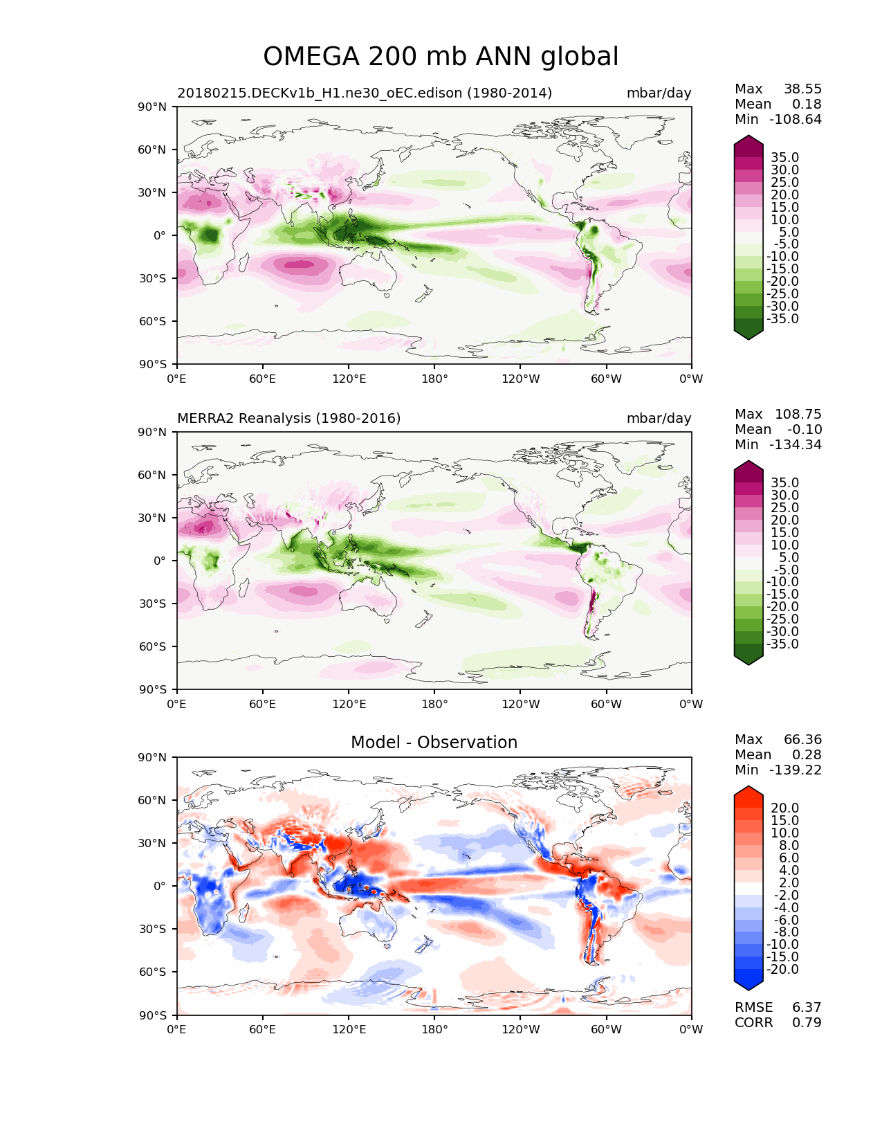 Use this command to recreate this image: | e3sm_diags lat_lon --no_viewer --case_id 'MERRA2' --sets 'lat_lon' --run_type 'model_vs_obs' --variables 'OMEGA' --seasons 'ANN' --regions 'global' --regrid_tool 'esmf' --regrid_method 'conservative' --plevs '200.0' --main_title 'OMEGA 200 mb ANN global' --backend 'mpl' --output_format 'png' --canvas_size_w '1212' --canvas_size_h '1628' --figsize '8.5' '11.0' --dpi '150' --arrows --contour_levels '-35' '-30' '-25' '-20' '-15' '-10' '-5' '5' '10' '15' '20' '25' '30' '35' --test_name '20180215.DECKv1b_H1.ne30_oEC.edison' --test_colormap 'PiYG_r' --ref_name 'MERRA2' --reference_name 'MERRA2 Reanalysis' --reference_colormap 'PiYG_r' --diff_title 'Model - Observation' --diff_colormap 'diverging_bwr.rgb' --diff_levels '-20' '-15' '-10' '-8' '-6' '-4' '-2' '2' '4' '6' '8' '10' '15' '20' --multiprocessing --num_workers '15' --granulate 'variables' 'seasons' 'plevs' 'regions' --selectors 'sets' 'seasons' --reference_data_path '/global/cfs/cdirs/e3sm/acme_diags/obs_for_e3sm_diags/climatology' --test_data_path '/global/cfs/cdirs/e3sm/zhang40/postprocessing_for_e3sm_diags/climo/20180215.DECKv1b_H1.ne30_oEC.edison/1980-2014/rgr' --results_dir '/global/cfs/cdirs/e3sm/www/zhang40/tests/v230_enso' |