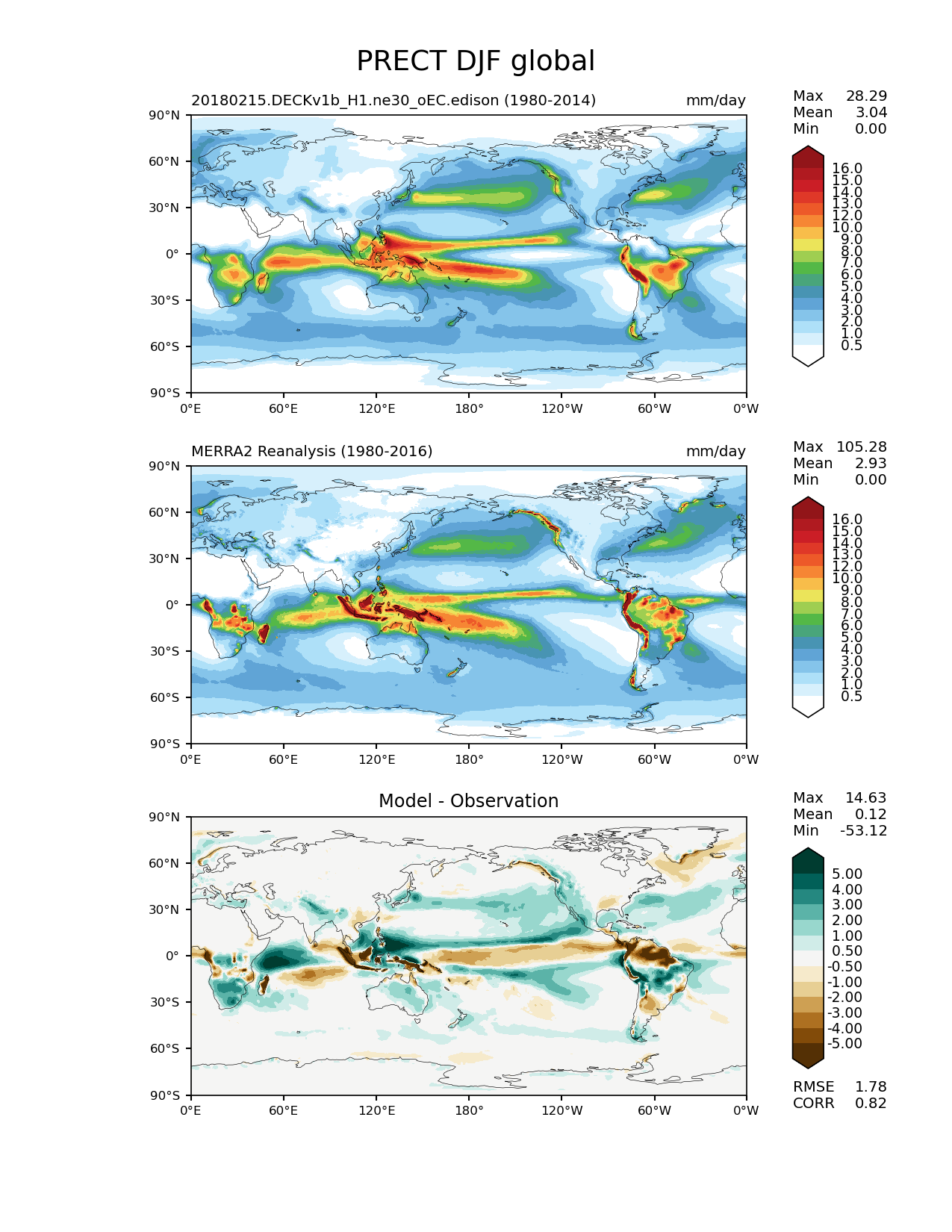 Use this command to recreate this image: | e3sm_diags lat_lon --no_viewer --case_id 'MERRA2' --sets 'lat_lon' --run_type 'model_vs_obs' --variables 'PRECT' --seasons 'DJF' --regions 'global' --regrid_tool 'esmf' --regrid_method 'conservative' --main_title 'PRECT DJF global' --backend 'mpl' --output_format 'png' --canvas_size_w '1212' --canvas_size_h '1628' --figsize '8.5' '11.0' --dpi '150' --arrows --contour_levels '0.5' '1' '2' '3' '4' '5' '6' '7' '8' '9' '10' '12' '13' '14' '15' '16' --test_name '20180215.DECKv1b_H1.ne30_oEC.edison' --test_colormap 'WhiteBlueGreenYellowRed.rgb' --ref_name 'MERRA2' --reference_name 'MERRA2 Reanalysis' --reference_colormap 'WhiteBlueGreenYellowRed.rgb' --diff_title 'Model - Observation' --diff_colormap 'BrBG' --diff_levels '-5' '-4' '-3' '-2' '-1' '-0.5' '0.5' '1' '2' '3' '4' '5' --multiprocessing --num_workers '15' --granulate 'variables' 'seasons' 'plevs' 'regions' --selectors 'sets' 'seasons' --reference_data_path '/global/cfs/cdirs/e3sm/acme_diags/obs_for_e3sm_diags/climatology' --test_data_path '/global/cfs/cdirs/e3sm/zhang40/postprocessing_for_e3sm_diags/climo/20180215.DECKv1b_H1.ne30_oEC.edison/1980-2014/rgr' --results_dir '/global/cfs/cdirs/e3sm/www/zhang40/tests/v230_enso' |