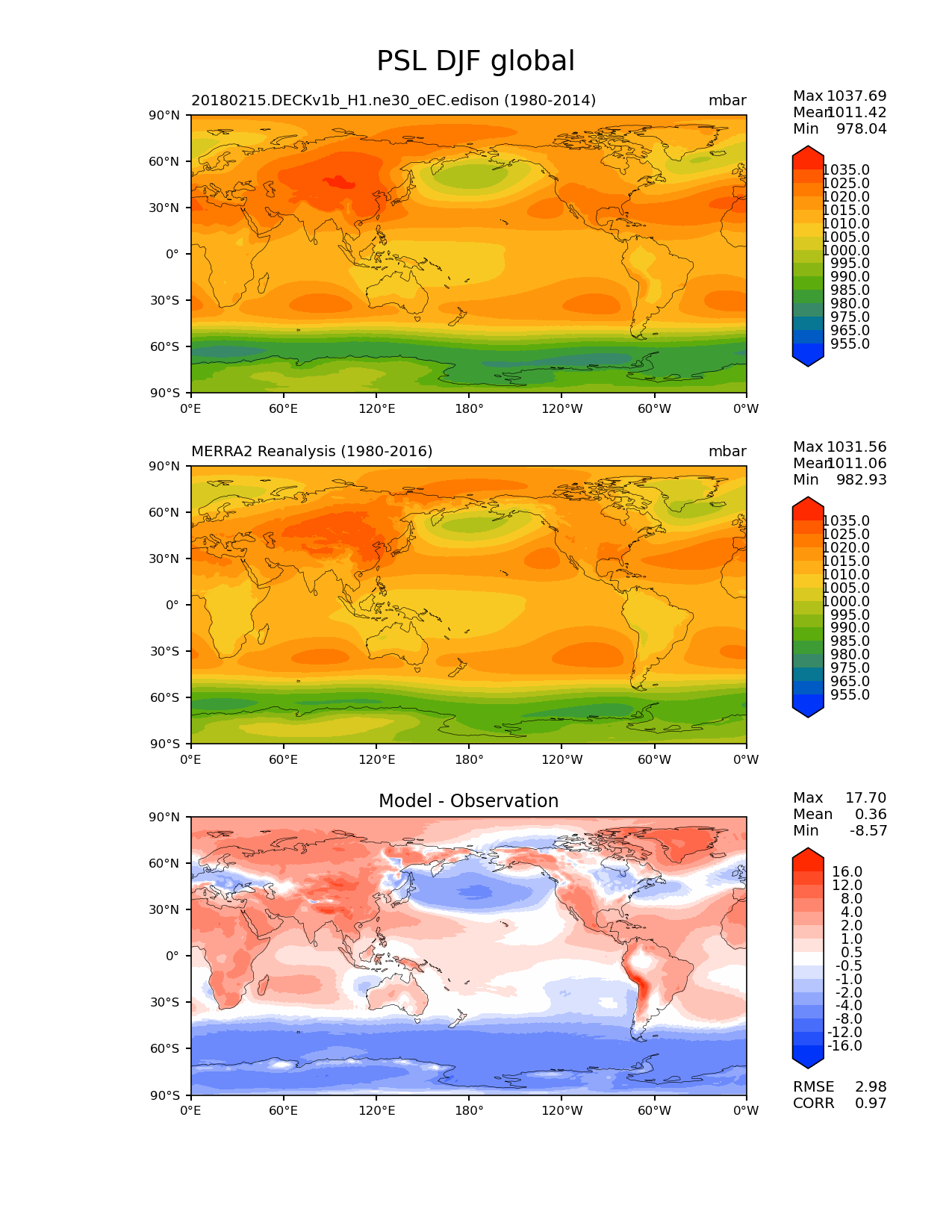 Use this command to recreate this image: | e3sm_diags lat_lon --no_viewer --case_id 'MERRA2' --sets 'lat_lon' --run_type 'model_vs_obs' --variables 'PSL' --seasons 'DJF' --regions 'global' --regrid_tool 'esmf' --regrid_method 'conservative' --main_title 'PSL DJF global' --backend 'mpl' --output_format 'png' --canvas_size_w '1212' --canvas_size_h '1628' --figsize '8.5' '11.0' --dpi '150' --arrows --contour_levels '955' '965' '975' '980' '985' '990' '995' '1000' '1005' '1010' '1015' '1020' '1025' '1035' --test_name '20180215.DECKv1b_H1.ne30_oEC.edison' --test_colormap 'cet_rainbow.rgb' --ref_name 'MERRA2' --reference_name 'MERRA2 Reanalysis' --reference_colormap 'cet_rainbow.rgb' --diff_title 'Model - Observation' --diff_colormap 'diverging_bwr.rgb' --diff_levels '-16' '-12' '-8' '-4' '-2' '-1' '-0.5' '0.5' '1' '2' '4' '8' '12' '16' --multiprocessing --num_workers '15' --granulate 'variables' 'seasons' 'plevs' 'regions' --selectors 'sets' 'seasons' --reference_data_path '/global/cfs/cdirs/e3sm/acme_diags/obs_for_e3sm_diags/climatology' --test_data_path '/global/cfs/cdirs/e3sm/zhang40/postprocessing_for_e3sm_diags/climo/20180215.DECKv1b_H1.ne30_oEC.edison/1980-2014/rgr' --results_dir '/global/cfs/cdirs/e3sm/www/zhang40/tests/v230_enso' |
