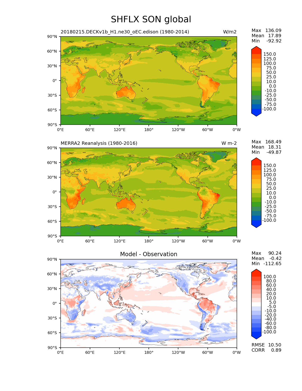 Use this command to recreate this image: | e3sm_diags lat_lon --no_viewer --case_id 'MERRA2' --sets 'lat_lon' --run_type 'model_vs_obs' --variables 'SHFLX' --seasons 'SON' --regions 'global' --regrid_tool 'esmf' --regrid_method 'conservative' --main_title 'SHFLX SON global' --backend 'mpl' --output_format 'png' --canvas_size_w '1212' --canvas_size_h '1628' --figsize '8.5' '11.0' --dpi '150' --arrows --contour_levels '-100' '-75' '-50' '-25' '-10' '0' '10' '25' '50' '75' '100' '125' '150' --test_name '20180215.DECKv1b_H1.ne30_oEC.edison' --test_colormap 'cet_rainbow.rgb' --ref_name 'MERRA2' --reference_name 'MERRA2 Reanalysis' --reference_colormap 'cet_rainbow.rgb' --diff_title 'Model - Observation' --diff_colormap 'diverging_bwr.rgb' --diff_levels '-100' '-80' '-60' '-40' '-20' '-10' '-5' '5' '10' '20' '40' '60' '80' '100' --multiprocessing --num_workers '15' --granulate 'variables' 'seasons' 'plevs' 'regions' --selectors 'sets' 'seasons' --reference_data_path '/global/cfs/cdirs/e3sm/acme_diags/obs_for_e3sm_diags/climatology' --test_data_path '/global/cfs/cdirs/e3sm/zhang40/postprocessing_for_e3sm_diags/climo/20180215.DECKv1b_H1.ne30_oEC.edison/1980-2014/rgr' --results_dir '/global/cfs/cdirs/e3sm/www/zhang40/tests/v230_enso' |