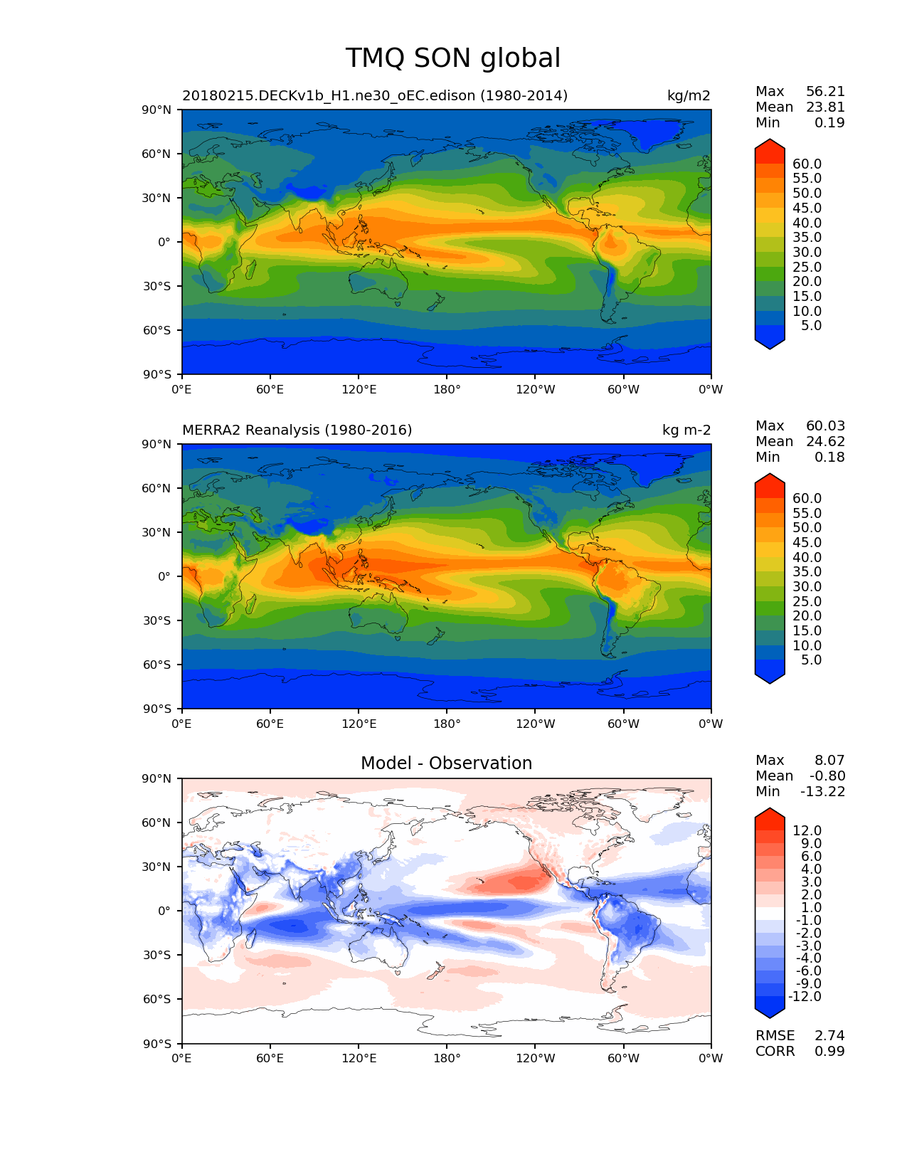 Use this command to recreate this image: | e3sm_diags lat_lon --no_viewer --case_id 'MERRA2' --sets 'lat_lon' --run_type 'model_vs_obs' --variables 'TMQ' --seasons 'SON' --regions 'global' --regrid_tool 'esmf' --regrid_method 'conservative' --main_title 'TMQ SON global' --backend 'mpl' --output_format 'png' --canvas_size_w '1212' --canvas_size_h '1628' --figsize '8.5' '11.0' --dpi '150' --arrows --contour_levels '5' '10' '15' '20' '25' '30' '35' '40' '45' '50' '55' '60' --test_name '20180215.DECKv1b_H1.ne30_oEC.edison' --test_colormap 'cet_rainbow.rgb' --ref_name 'MERRA2' --reference_name 'MERRA2 Reanalysis' --reference_colormap 'cet_rainbow.rgb' --diff_title 'Model - Observation' --diff_colormap 'diverging_bwr.rgb' --diff_levels '-12' '-9' '-6' '-4' '-3' '-2' '-1' '1' '2' '3' '4' '6' '9' '12' --multiprocessing --num_workers '15' --granulate 'variables' 'seasons' 'plevs' 'regions' --selectors 'sets' 'seasons' --reference_data_path '/global/cfs/cdirs/e3sm/acme_diags/obs_for_e3sm_diags/climatology' --test_data_path '/global/cfs/cdirs/e3sm/zhang40/postprocessing_for_e3sm_diags/climo/20180215.DECKv1b_H1.ne30_oEC.edison/1980-2014/rgr' --results_dir '/global/cfs/cdirs/e3sm/www/zhang40/tests/v230_enso' |
