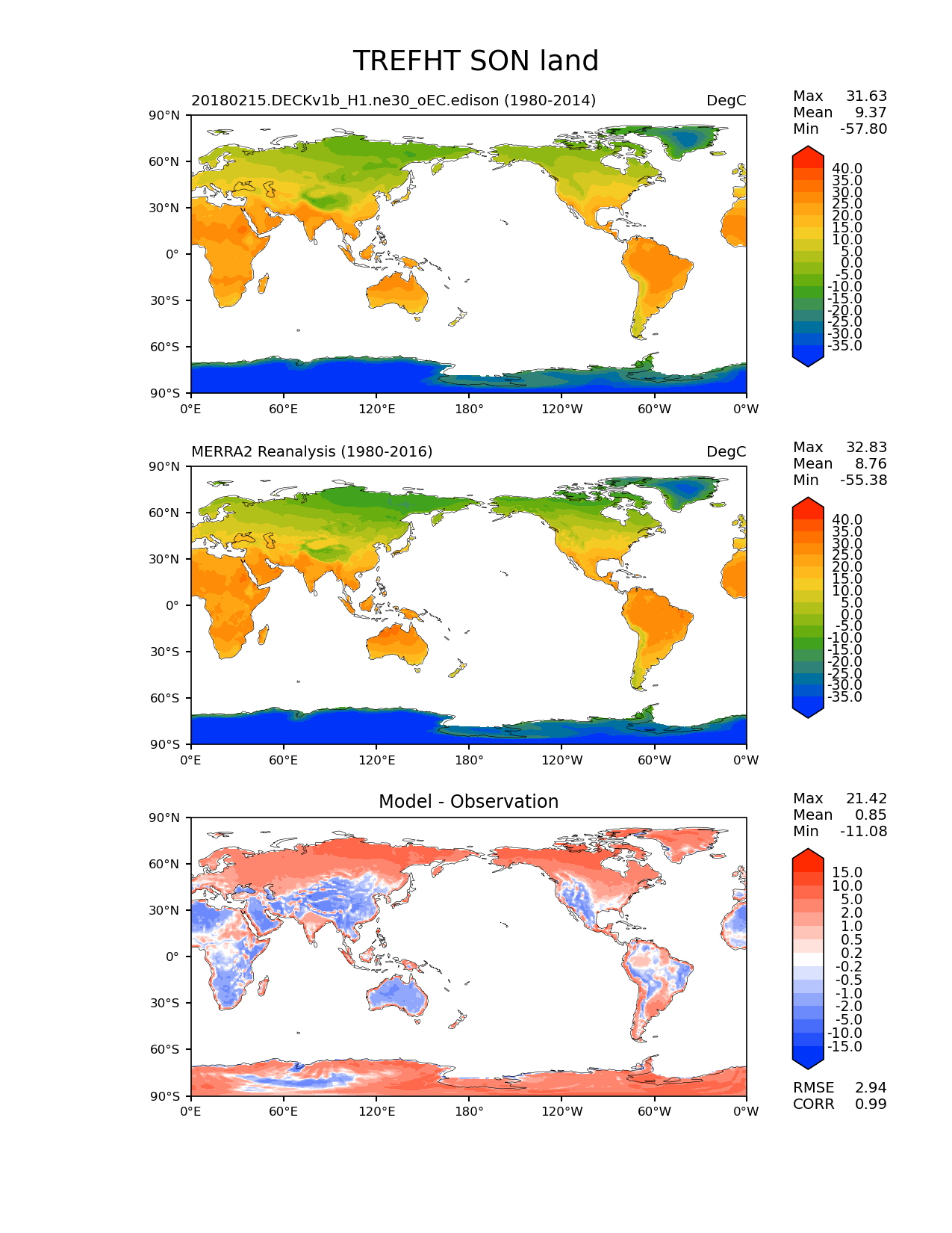 Use this command to recreate this image: | e3sm_diags lat_lon --no_viewer --case_id 'MERRA2' --sets 'lat_lon' --run_type 'model_vs_obs' --variables 'TREFHT' --seasons 'SON' --regions 'land' --regrid_tool 'esmf' --regrid_method 'conservative' --main_title 'TREFHT SON land' --backend 'mpl' --output_format 'png' --canvas_size_w '1212' --canvas_size_h '1628' --figsize '8.5' '11.0' --dpi '150' --arrows --contour_levels '-35' '-30' '-25' '-20' '-15' '-10' '-5' '0' '5' '10' '15' '20' '25' '30' '35' '40' --test_name '20180215.DECKv1b_H1.ne30_oEC.edison' --test_colormap 'cet_rainbow.rgb' --ref_name 'MERRA2' --reference_name 'MERRA2 Reanalysis' --reference_colormap 'cet_rainbow.rgb' --diff_title 'Model - Observation' --diff_colormap 'diverging_bwr.rgb' --diff_levels '-15' '-10' '-5' '-2' '-1' '-0.5' '-0.2' '0.2' '0.5' '1' '2' '5' '10' '15' --multiprocessing --num_workers '15' --granulate 'variables' 'seasons' 'plevs' 'regions' --selectors 'sets' 'seasons' --reference_data_path '/global/cfs/cdirs/e3sm/acme_diags/obs_for_e3sm_diags/climatology' --test_data_path '/global/cfs/cdirs/e3sm/zhang40/postprocessing_for_e3sm_diags/climo/20180215.DECKv1b_H1.ne30_oEC.edison/1980-2014/rgr' --results_dir '/global/cfs/cdirs/e3sm/www/zhang40/tests/v230_enso' |