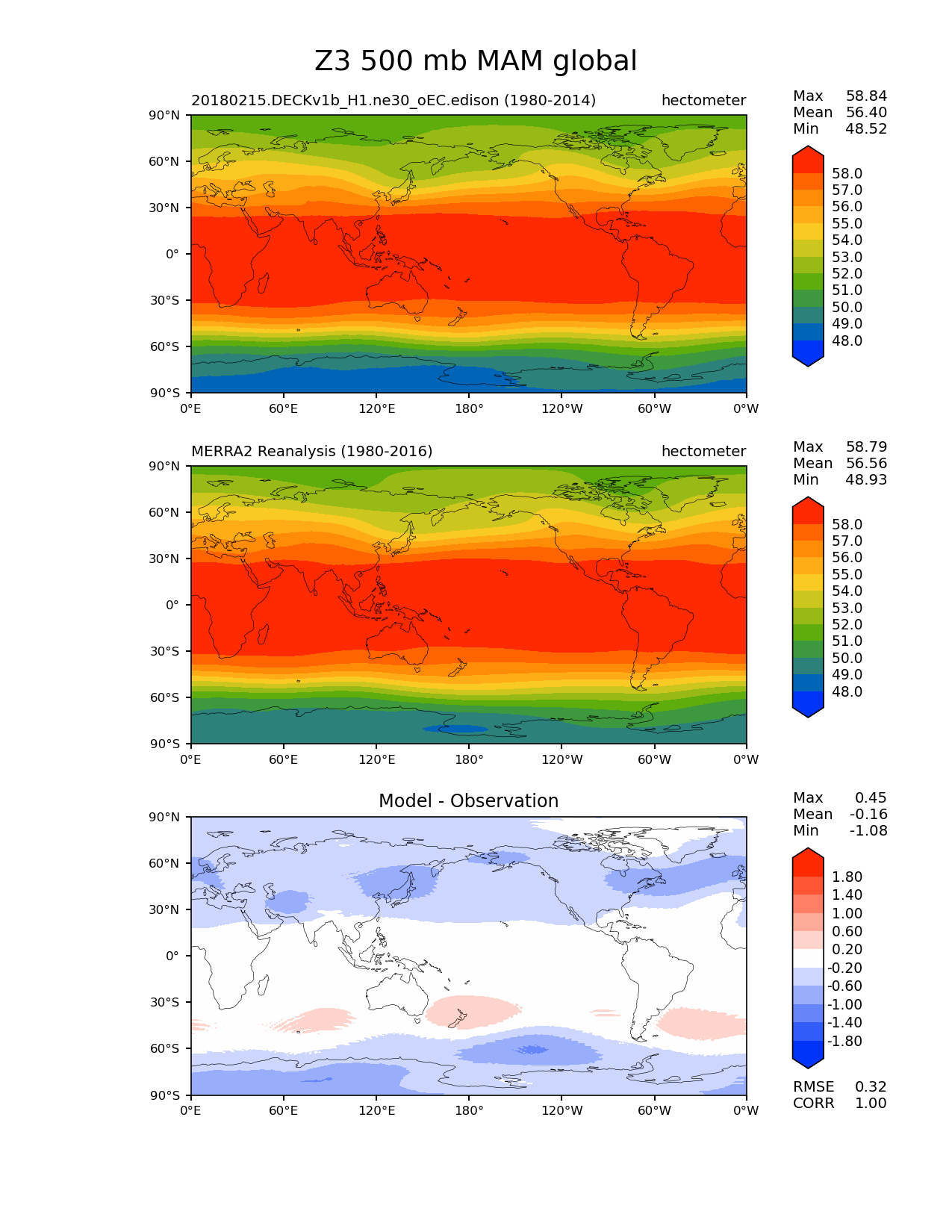 Use this command to recreate this image: | e3sm_diags lat_lon --no_viewer --case_id 'MERRA2' --sets 'lat_lon' --run_type 'model_vs_obs' --variables 'Z3' --seasons 'MAM' --regions 'global' --regrid_tool 'esmf' --regrid_method 'conservative' --plevs '500.0' --main_title 'Z3 500 mb MAM global' --backend 'mpl' --output_format 'png' --canvas_size_w '1212' --canvas_size_h '1628' --figsize '8.5' '11.0' --dpi '150' --arrows --contour_levels '48' '49' '50' '51' '52' '53' '54' '55' '56' '57' '58' --test_name '20180215.DECKv1b_H1.ne30_oEC.edison' --test_colormap 'cet_rainbow.rgb' --ref_name 'MERRA2' --reference_name 'MERRA2 Reanalysis' --reference_colormap 'cet_rainbow.rgb' --diff_title 'Model - Observation' --diff_colormap 'diverging_bwr.rgb' --diff_levels '-1.8' '-1.4' '-1.0' '-0.6' '-0.2' '0.2' '0.6' '1.0' '1.4' '1.8' --multiprocessing --num_workers '15' --granulate 'variables' 'seasons' 'plevs' 'regions' --selectors 'sets' 'seasons' --reference_data_path '/global/cfs/cdirs/e3sm/acme_diags/obs_for_e3sm_diags/climatology' --test_data_path '/global/cfs/cdirs/e3sm/zhang40/postprocessing_for_e3sm_diags/climo/20180215.DECKv1b_H1.ne30_oEC.edison/1980-2014/rgr' --results_dir '/global/cfs/cdirs/e3sm/www/zhang40/tests/v230_enso' |