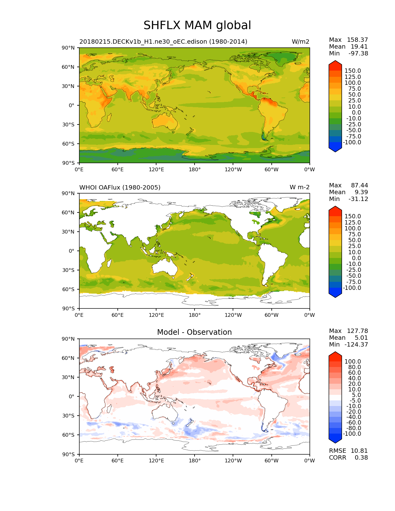 Use this command to recreate this image: | e3sm_diags lat_lon --no_viewer --case_id 'WHOI-OAFlux' --sets 'lat_lon' --run_type 'model_vs_obs' --variables 'SHFLX' --seasons 'MAM' --regions 'global' --regrid_tool 'esmf' --regrid_method 'conservative' --main_title 'SHFLX MAM global' --backend 'mpl' --output_format 'png' --canvas_size_w '1212' --canvas_size_h '1628' --figsize '8.5' '11.0' --dpi '150' --arrows --contour_levels '-100' '-75' '-50' '-25' '-10' '0' '10' '25' '50' '75' '100' '125' '150' --test_name '20180215.DECKv1b_H1.ne30_oEC.edison' --test_colormap 'cet_rainbow.rgb' --ref_name 'OAFlux' --reference_name 'WHOI OAFlux' --reference_colormap 'cet_rainbow.rgb' --diff_title 'Model - Observation' --diff_colormap 'diverging_bwr.rgb' --diff_levels '-100' '-80' '-60' '-40' '-20' '-10' '-5' '5' '10' '20' '40' '60' '80' '100' --multiprocessing --num_workers '15' --granulate 'variables' 'seasons' 'plevs' 'regions' --selectors 'sets' 'seasons' --reference_data_path '/global/cfs/cdirs/e3sm/acme_diags/obs_for_e3sm_diags/climatology' --test_data_path '/global/cfs/cdirs/e3sm/zhang40/postprocessing_for_e3sm_diags/climo/20180215.DECKv1b_H1.ne30_oEC.edison/1980-2014/rgr' --results_dir '/global/cfs/cdirs/e3sm/www/zhang40/tests/v230_enso' |