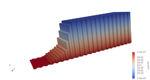 The geometry does not represent a particularly realistic ice-shelf cavity but it is a quick and useful test of the parameterization of land-ice melt fluxes and of frazil formation below ice shelves.