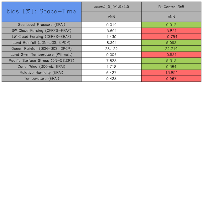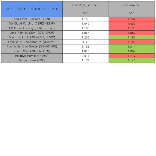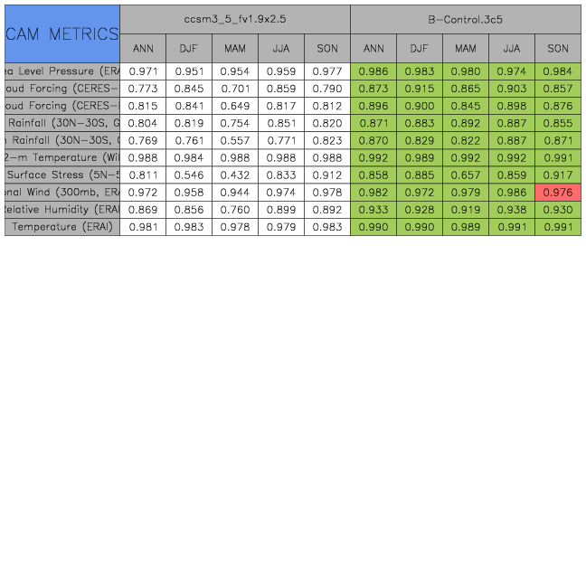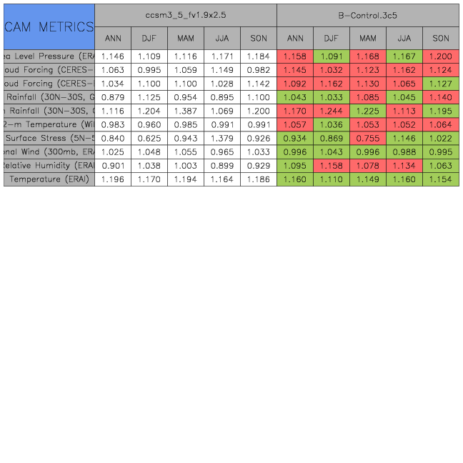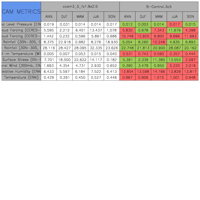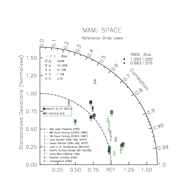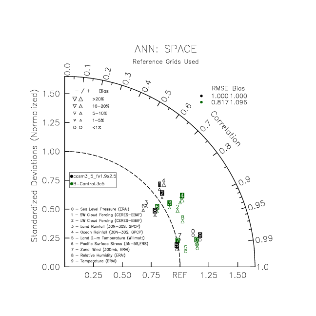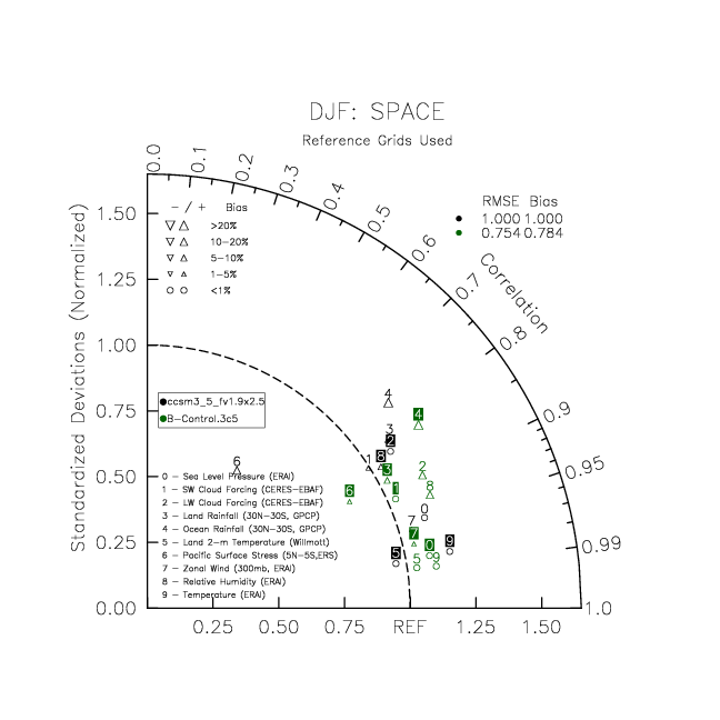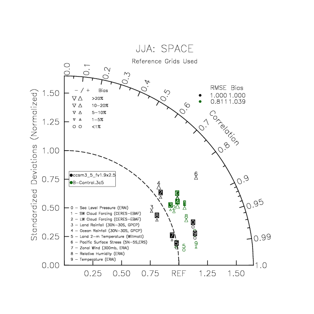 Taylor Diagrams were developed by Karl Taylor at PCMDI (paper|tech note) and aim to condense information about variance and RMSE characteristics of a particular model run when compared with observations in a single diagram. The tables summarize the individual metrics for each variable considered including: